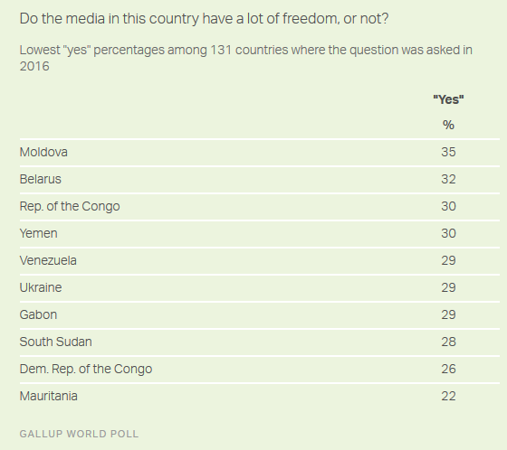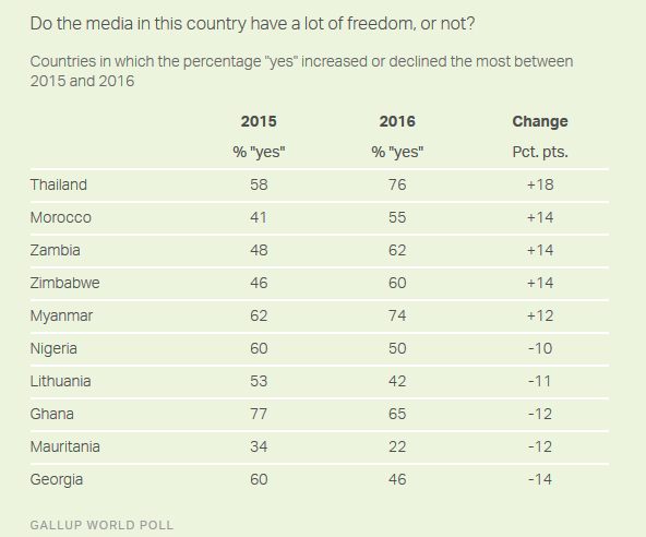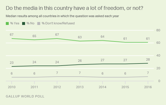 盖洛普:全球61%的人口认为其所在国家的媒体是自由的 199IT原创编译 假新闻甚嚣尘上,媒体自由比以往任何时候更受关注。 总体而言,近几年全球对媒体自由的看法变化不大。在接受盖洛普民意调查的131个国家中,有61%的居民表示媒体在其各自的国家有很大的自由,而28%的受访者不同意这一说法。 然而,媒体自由的状况在全世界各不相同。 欧洲国家的媒体自由度更高,在丹麦、挪威、芬兰、瑞士、荷兰、爱尔兰和瑞典,超过90%的居民表示媒体有很大的自由。美国媒体自由度下降至82%。 泰国媒体自由度有很大改善,从2015年的58%上升至2016年76%。 199IT.com原创编译自:盖洛普 非授权请勿转载 更多阅读:盖洛普:消费者不信任企业持有在线信息的安全性盖洛普:58%的美国人接受高等教育的目的是找份好工作盖洛普:2022年全球职场报告富国银行&盖洛普:2018年第三季度小企业指数盖洛普:调查显示美国人投资观 富爱买房穷买金盖洛普:调查显示全球3%最富的人拥有全球20%的总收入盖洛普:股市衰退以来美国人更倾向于节俭了盖洛普:调查显示中国已经成为继美国后最受欢迎的投资国盖洛普:45%的美国人相信大众媒体的新闻报道盖洛普:调查显示喝葡萄酒的人多是人生赢家盖洛普:调查显示33%的受访者表示他们目前的主管是女性盖洛普:2025年中国法律与秩序指数93分,全球第四盖洛普:调查显示70% Facebook用户并不格外关注隐私盖洛普:2022年日本希望为公司做出贡献的员工比例仅为5% 连续四年位于历史最低爱思唯尔:科研的信任