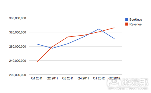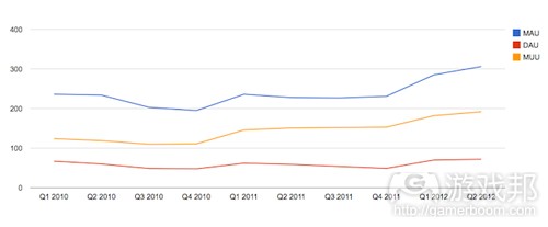 Zynga日前公布2012年第二季度财报显示,公司在该时期收益为3.32亿美元(同比去年增长19%,但仍低于华尔街预期的3.44亿美元);月活跃用户达3.06亿,比去年同期的2.28亿增长34%,比第一季度的2.92亿增长4%。日活跃用户为7200万,同比去年的5900万增长23%,比第一季度的6200万增长16%(注:据gamasutra报道,Zynga第二季度的用户日均收益已从去年同期的0.051美元降至0.046美元,这意味着用户在Zynga游戏中的消费额正在下降)。