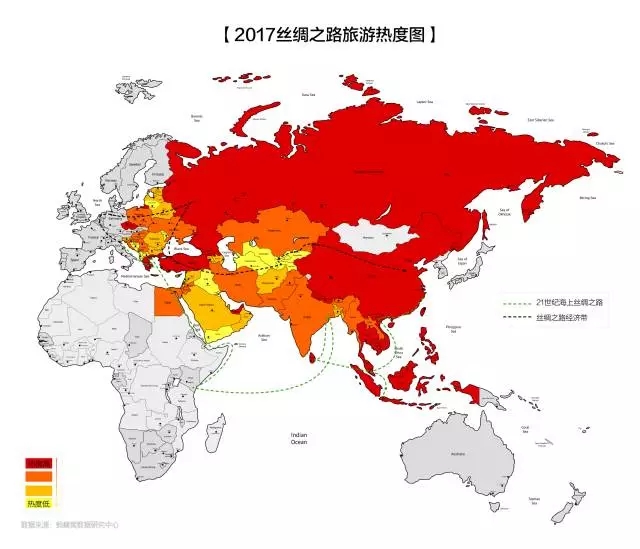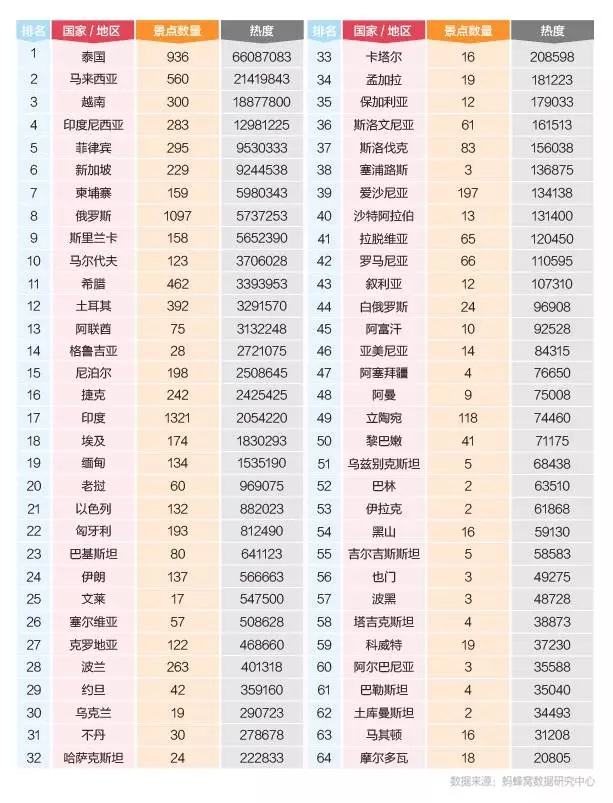 近日,中国领先的自由行服务平台蚂蜂窝发布了《2017丝绸之路旅游大数据报告》,综合蚂蜂窝大数据平台中用户搜索热度、游记发布数量、点评数量等指标,对“一带一路”沿线64个境外国家和地区的旅游热度、旅游资源分布进行了分析。