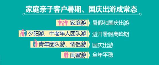 与家庭游客户出游时间较为集中不同,时间更充裕的夕阳游、中老年团队游客户在出游时间上主动避开了暑假高峰期;青年团队游客户、夫妻游客户更多地选择在国庆出游;闺蜜游全年出游时间比较均衡、随性。