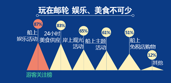 游客最关注邮轮旅游过程中的哪些核心要素?较多游客已逐渐摆脱“邮轮游是指通过邮轮将游客送达某个景点”的狭隘观念,而是更关注邮轮上的活动、表演以及美食,愿意“玩在邮轮”。众多邮轮公司也开始在吃的方面更加强调中国特色,从而满足中国游客的餐饮需求。