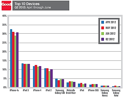 从Good Technology统计的2012年第二季度企业市场移动设备激活排名来看,前四位都是iOS设备,且领先势头明显。只有iPad一代和iPhone 3GS从上一季度的第五、六名降到了第七、八名。三星Galaxy S II和摩托罗拉Droid Razr排名上升。