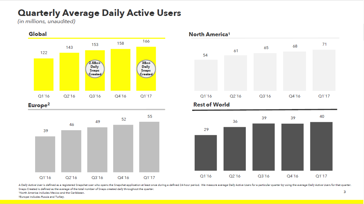 那么Snapchat的用户增长究竟如何?根据2017年1季度Snap公司的财报,Snapchat的日活跃用户达到了1.66亿人,每天发送的Snaps(小视频)数量高达30亿个,人均18条,而去年3季度为25亿次。
