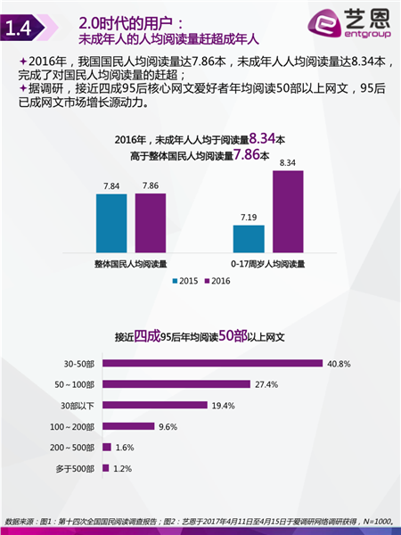 别以为95后不爱看书。根据第十四次全国国民阅读调查报告显示,2016年我国国民人均阅读量为7.86本,18岁以下未成年人人均阅读量高达8.34本,完成了对国民人均阅读量的赶超。事实上,近四成95后核心网文爱好者年均阅读50部以上网文,近五成95后每日阅读时长在1-2小时之间。在游戏、动漫、音乐等娱乐活动外,能在文字世界自由飞翔的网络文学,依然牢牢抓住了95后的时间。