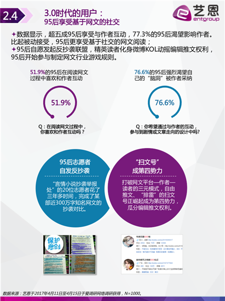 与时俱进的95后们已开始“抢班夺权”,参与制定网文行业的游戏规则。数据显示,超过51.9%的95后在阅读网文过程中享受与作者互动,76.6%的95后强烈渴望自己脑洞被作者采纳。相比被动接受的上一代,95后更享受社交化的网文阅读体验。近年来,不少95后自愿发起反抄袭联盟,为作者维权的新闻屡见不鲜。一部分精英读者,还会在社交媒体自由推文“排雷”,化身KOL动摇网文编辑话语权。