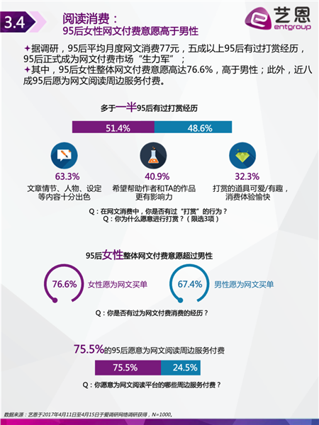 95后为爱好消费的欲望和行动力令人吃惊。据调研,95后平均月度网文消费77元,超过五成的95后有过付费打赏经历。63.3%的95后表示愿为文章情节、人物、设定等优质内容打赏,40.9%的95后希望通过打赏帮助作者和TA的作品更有影响力。其中,95后女性在整体网文付费意愿超过男性,近八成95后愿为网文阅读周边服务付费。