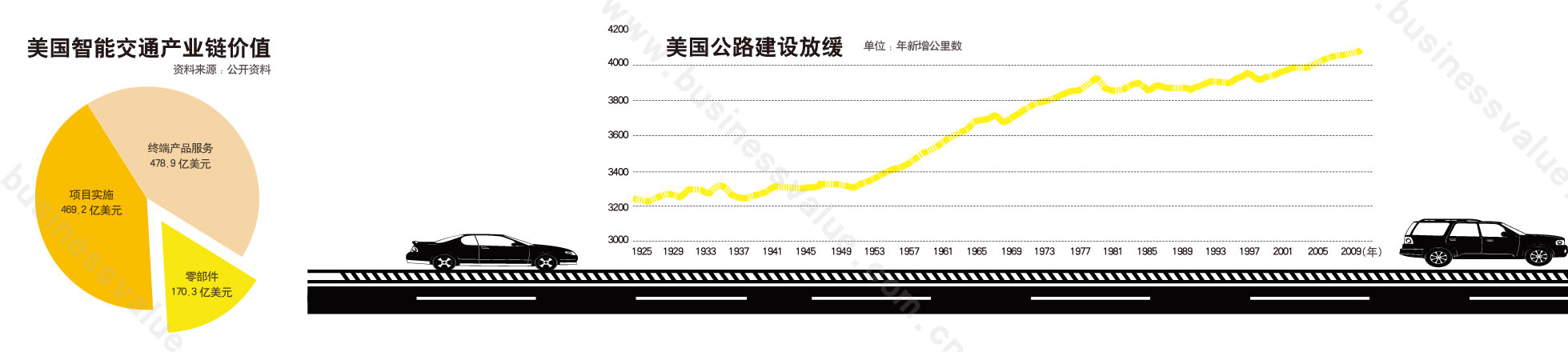 智能交通未来市场前景非常好,以美国为例,目前美国智能交通价值链总规模已经超过千亿美元。主要由零部件生产、项目实施和终端产品和服务等三部分组成。其中零部件生产市场规模约170.3亿美元,项目实施包括通信系统建设、系统集成、建筑设计、工程、规划和咨询等内容,市场规模约为469.2亿美元;终端产品和服务部分包括专用车辆、电脑系统设计、广播电视及无线通信设备、计算机、电话设备、道路桥梁建设、电脑外围设备、视听设备和电脑存储设备等,市场规模约478.9亿美元,超过互联网广告、计算机制造、电影和视频制造等行业市场规模,其中产品约261亿美元,服务约219亿美元,三项加总全行业价值链总规模约1118.4亿美元。