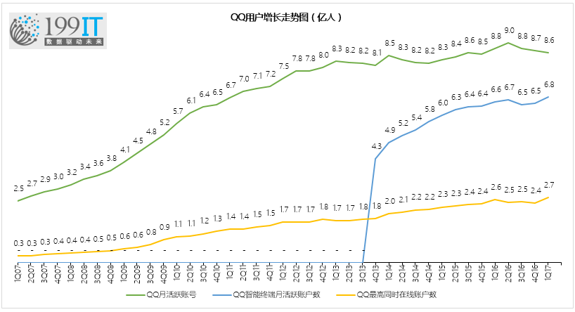 从下图QQ月活跃账号的走势可以看出,迈入8亿用户大关后,QQ基本上就结束了过去高速增长的时代,一方面是网民不够用了,另一方面生于智能手机的同门兄弟微信的替代是另一个因素。1季度QQ同时在线认识达到2.7亿,智能手机QQ用户数达到6.8亿,两者都创了新高。