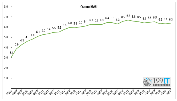 QQ用户增长的放缓和下滑也影响了Qzone(QQ空间)的表现,数据上可以看出Qzone的月活跃用户目前徘徊在6.3~6.5亿人之间,而为了吸引用户Qzone也大力发展直播和搜索应用以增加用户粘性。