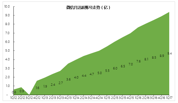根据腾讯2017年1季度披露的数据,社交平台方面,QQ 月活跃账户数达到 8.61 亿,比去年同期下降 2%。而微信和WeChat 的合并月活跃账户数达到 9.38 亿,比去年同期增长 23%。从数据上看,毫无疑问微信已经接下了QQ的下一棒。