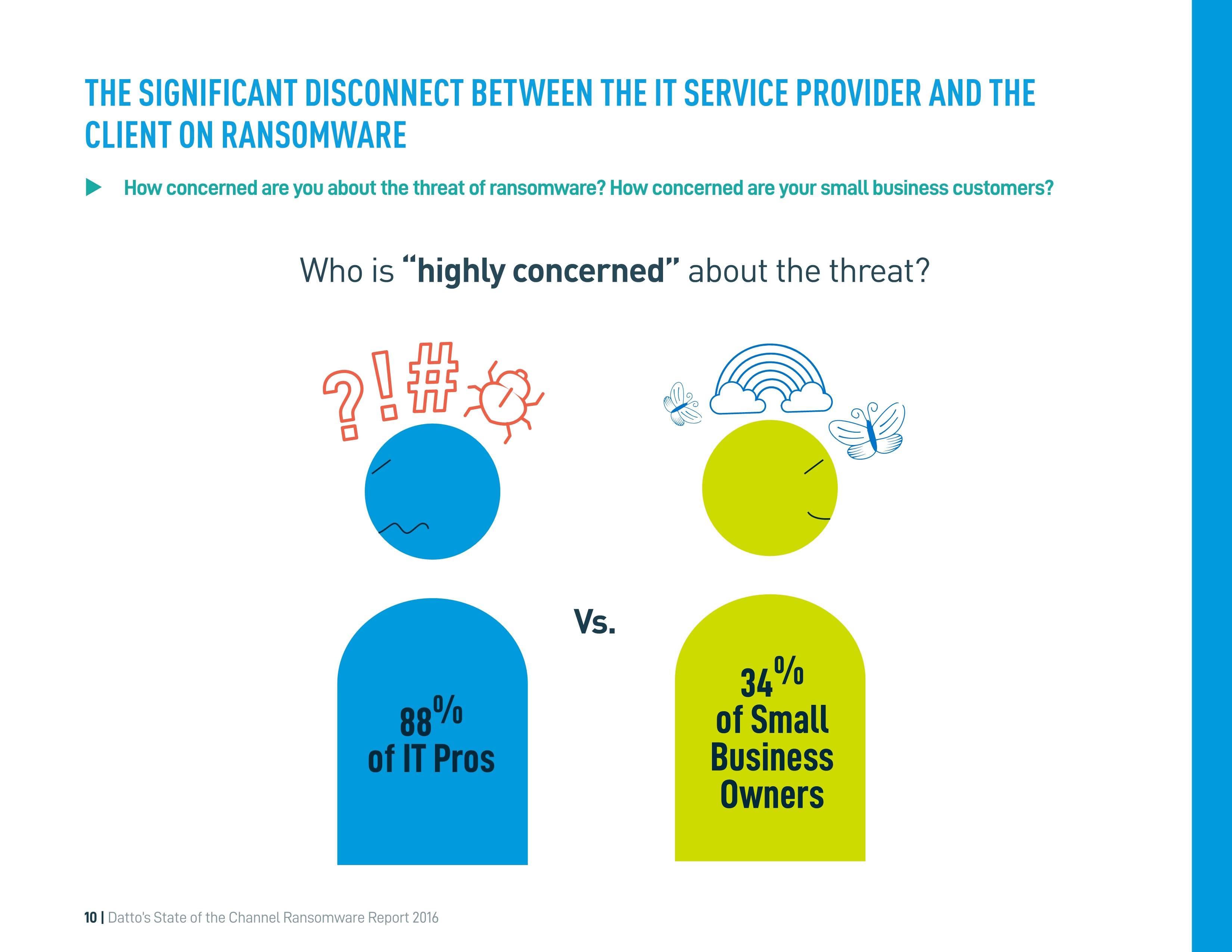 IT服务提供商和小企业客户对勒索病毒威胁的态度不同,大部分IT服务提供商非常担忧,但是只有34%的终端用户对此担忧。部分原因是缺少认知。