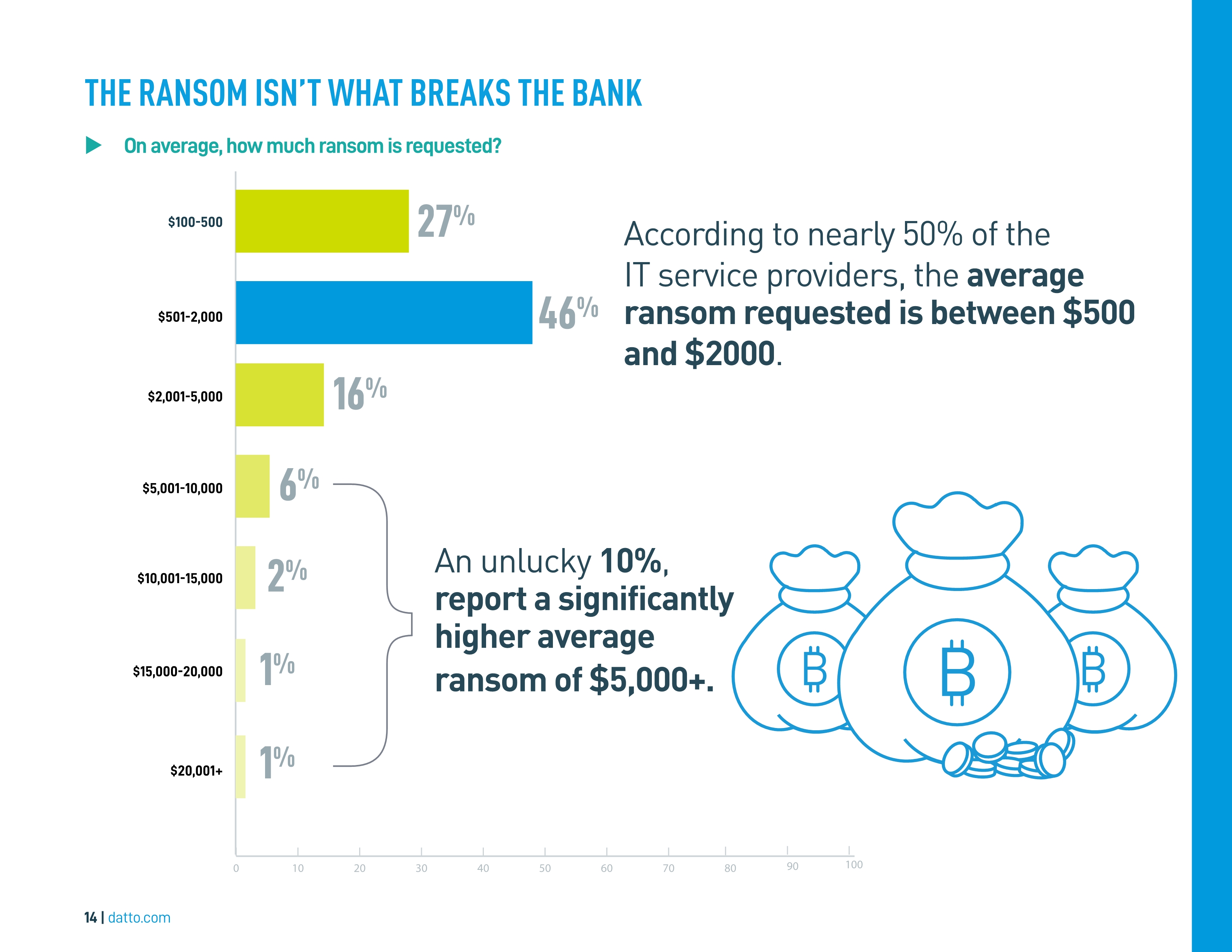 勒索病毒平均赎金在500美元到2000美元之间,但是10%的小企业曾遇到过赎金高于5000美元的勒索病毒。