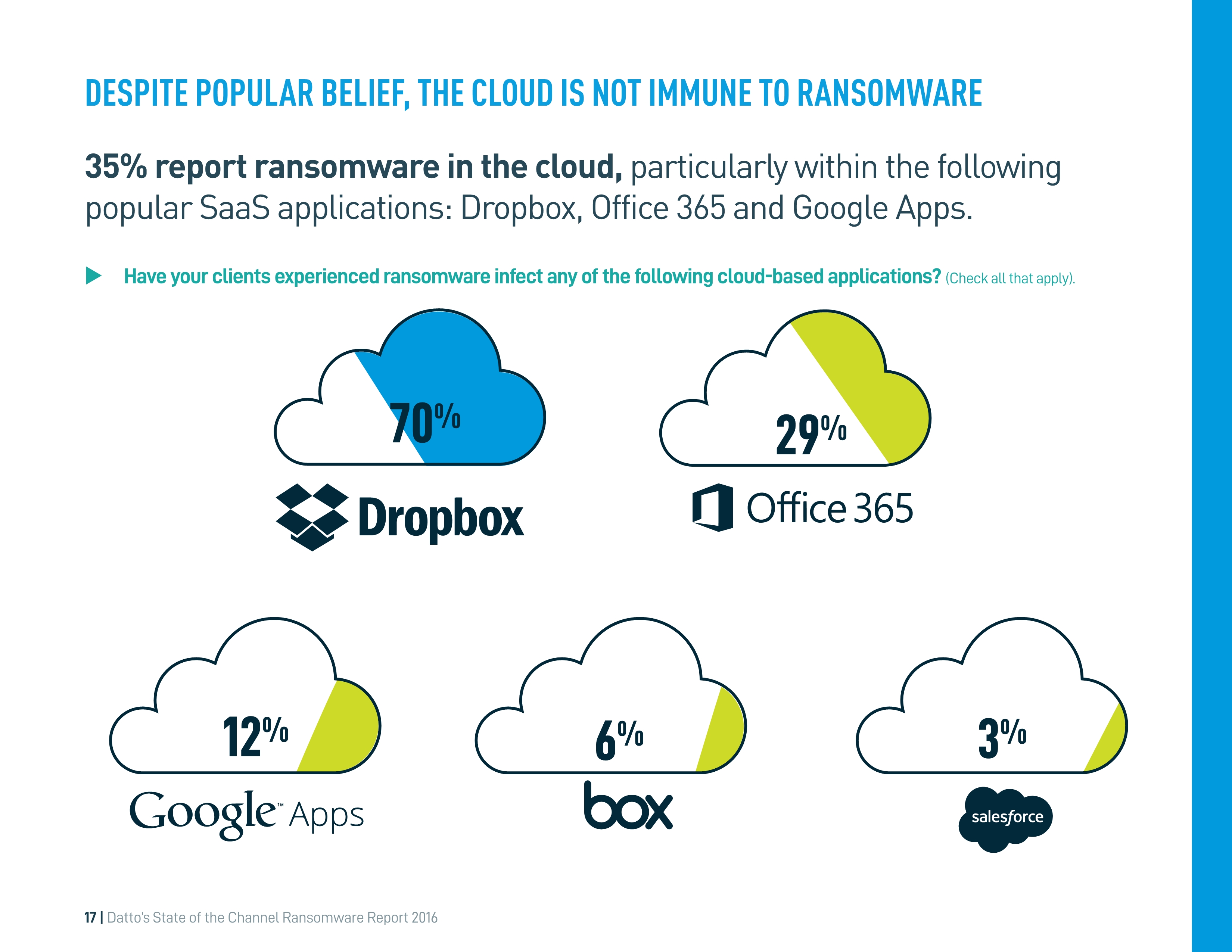 35%的IT服务提供商报告,基于云服务的应用成为勒索病毒的目标,特别是Dropbox、Office 365 和Google Apps。