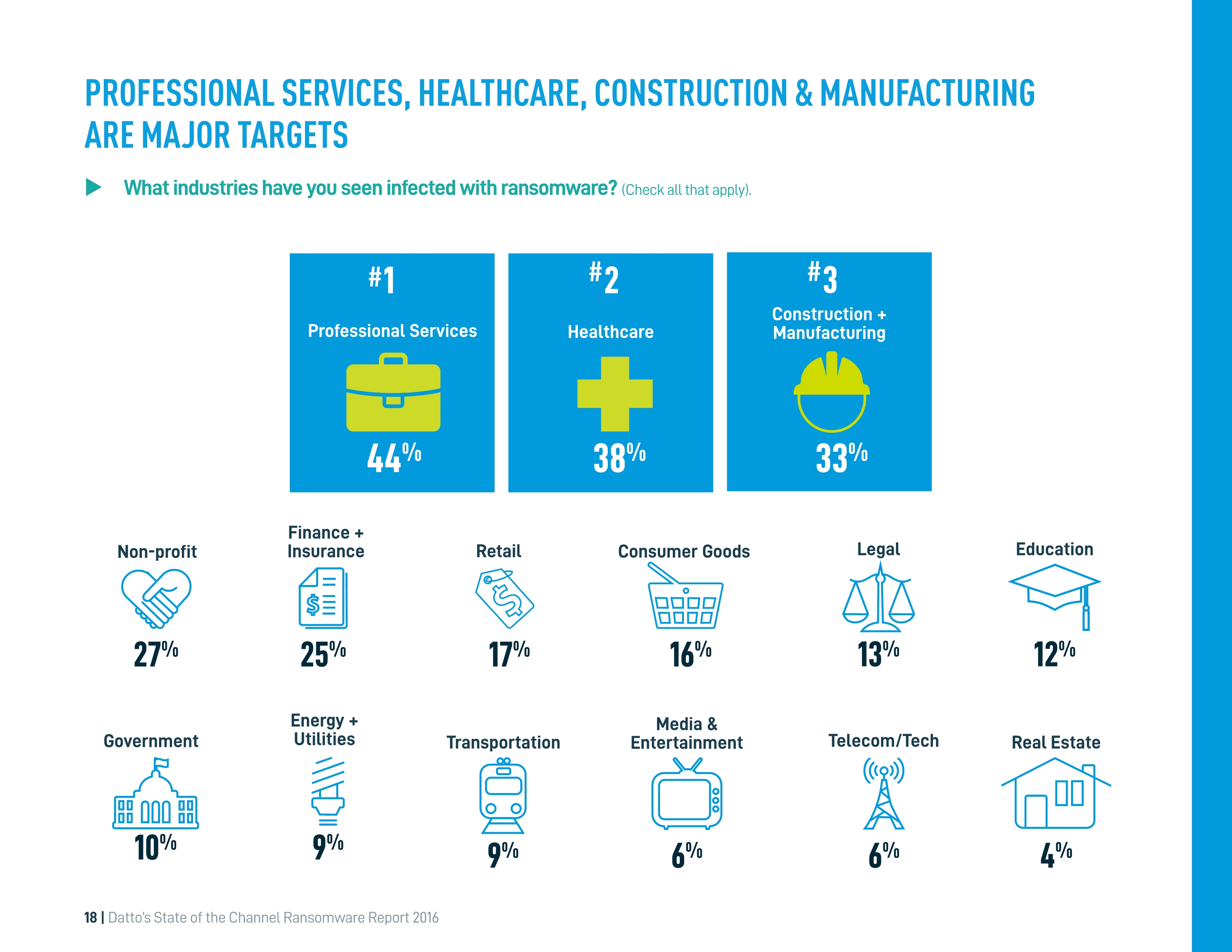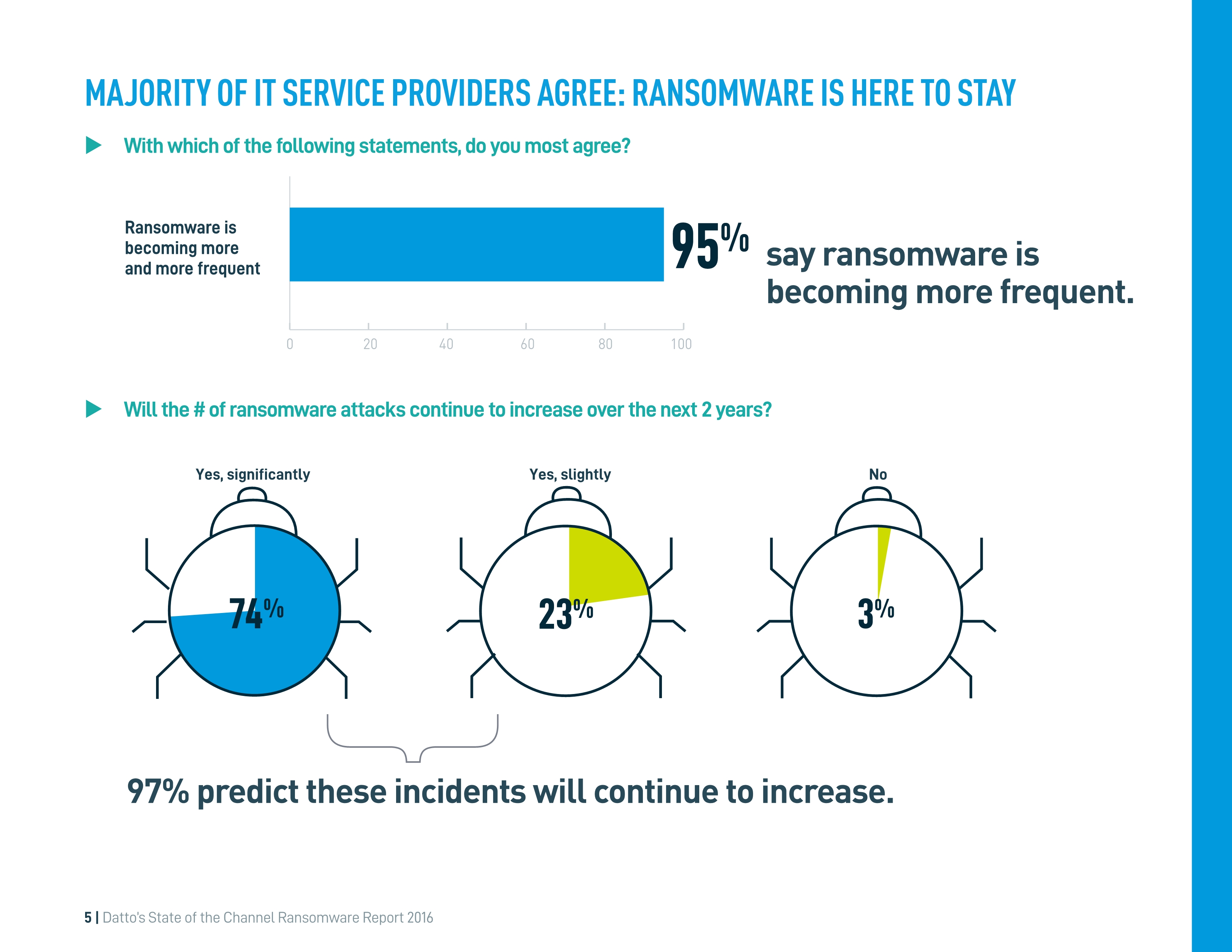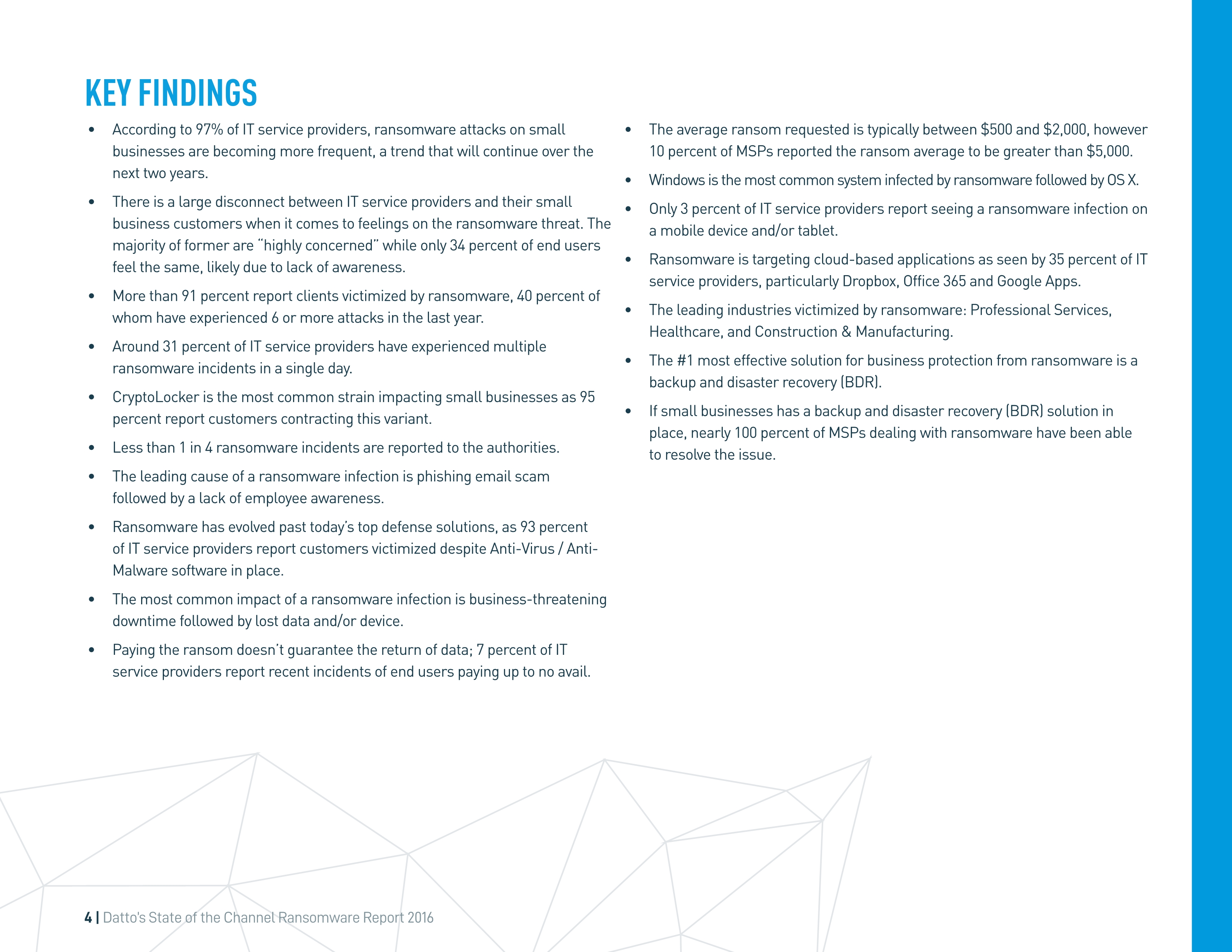 Datto发布了“2016年勒索病毒报告”,报告要点包括:
