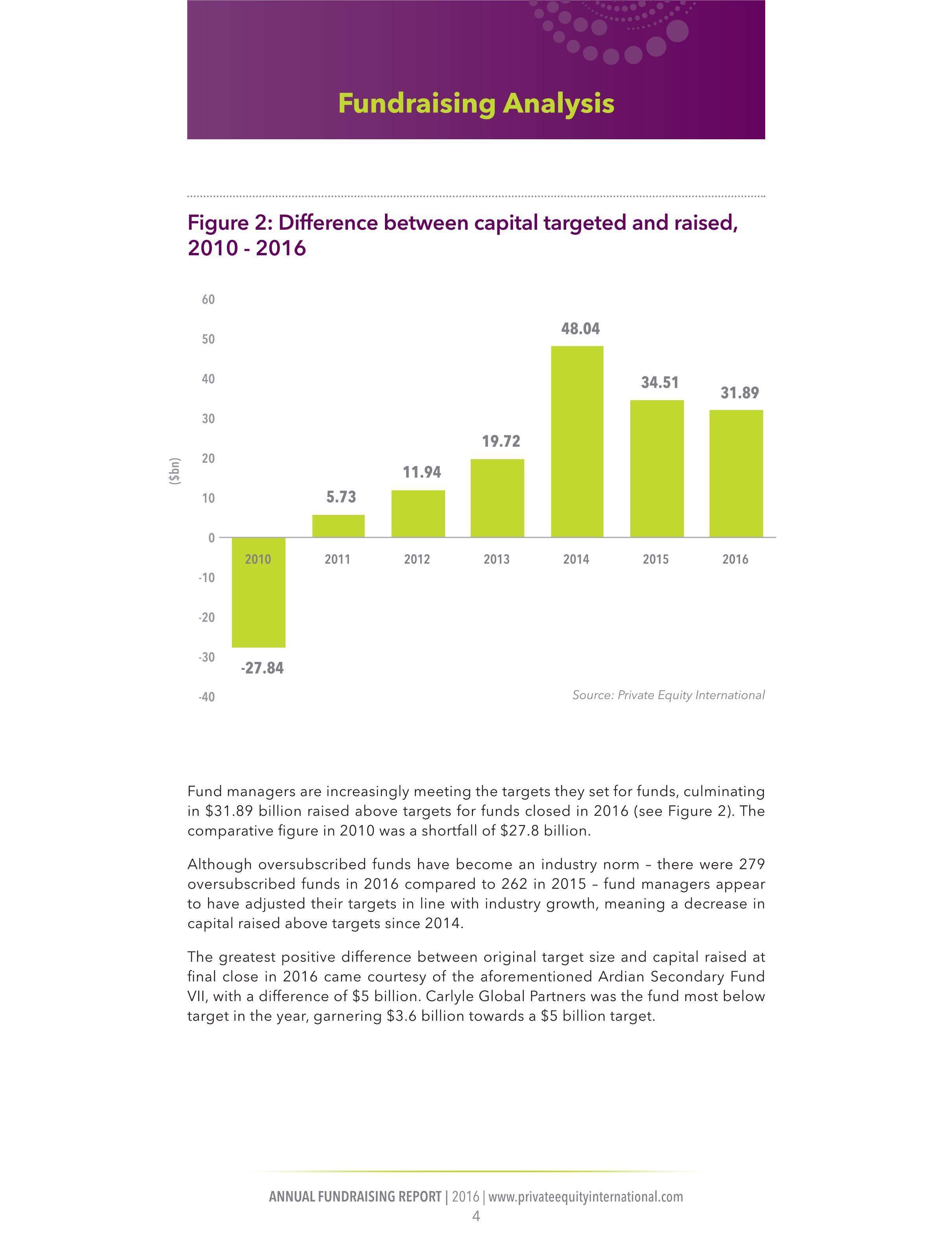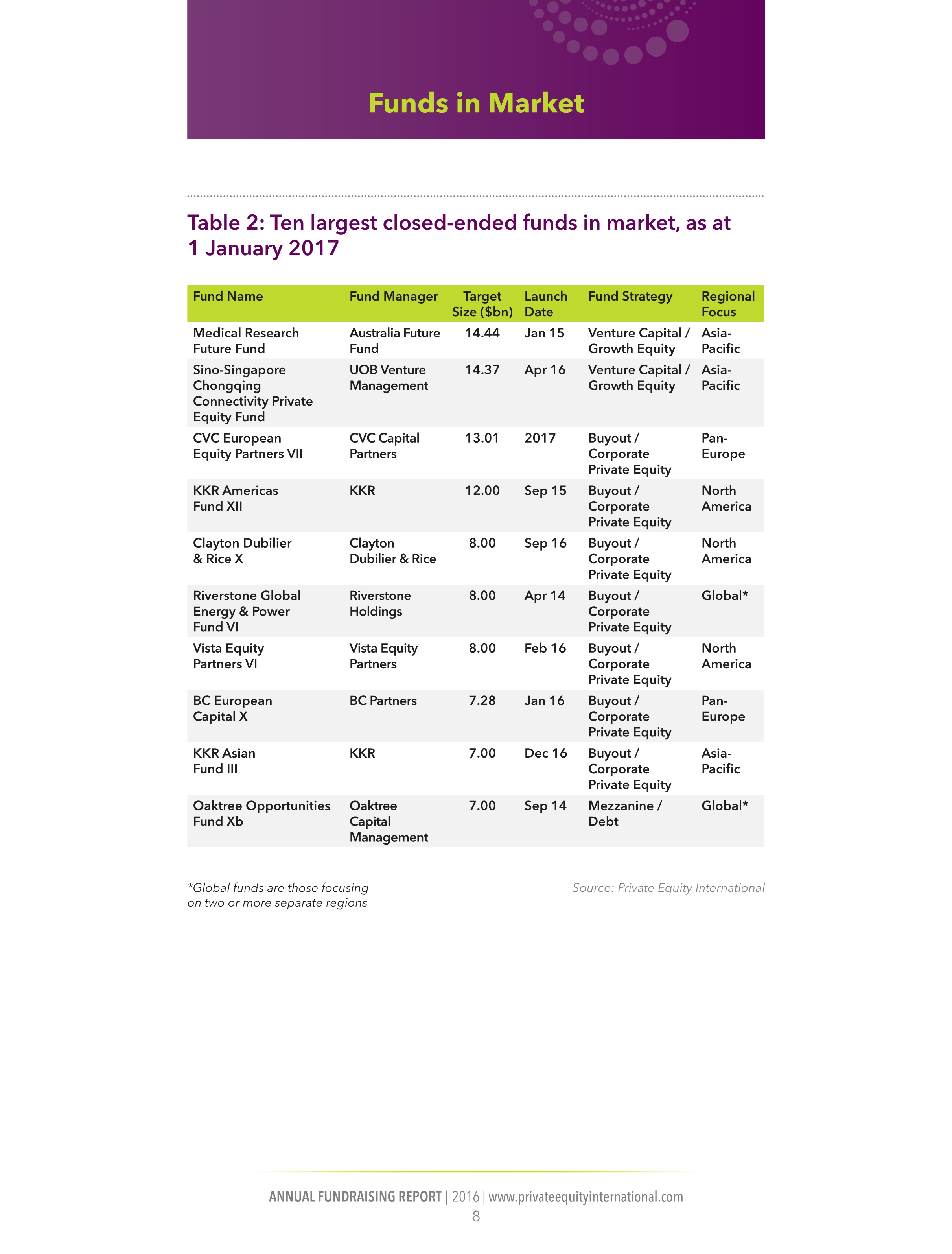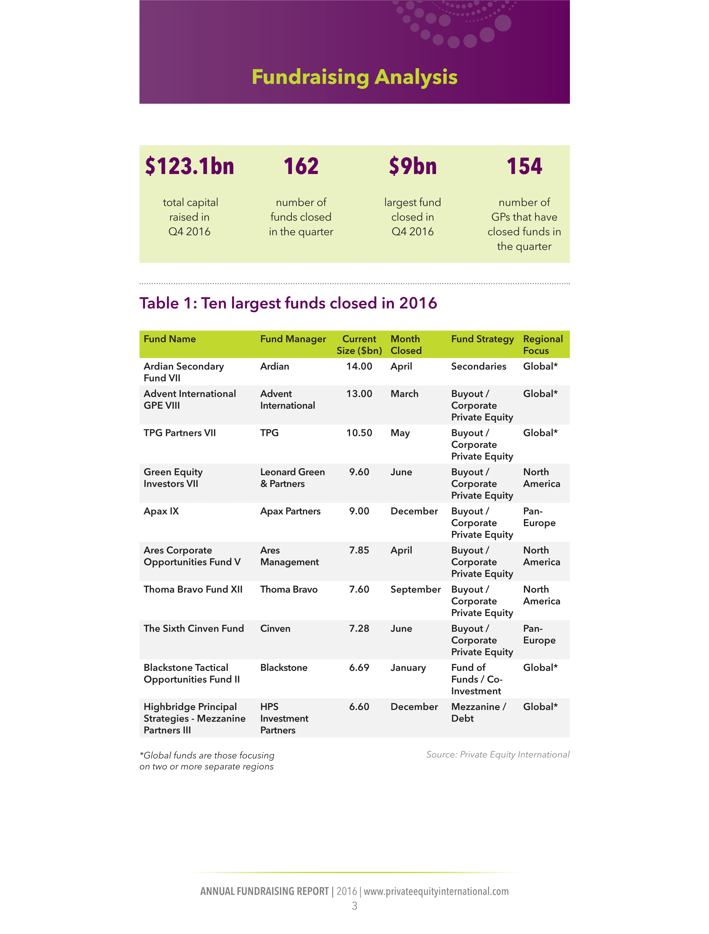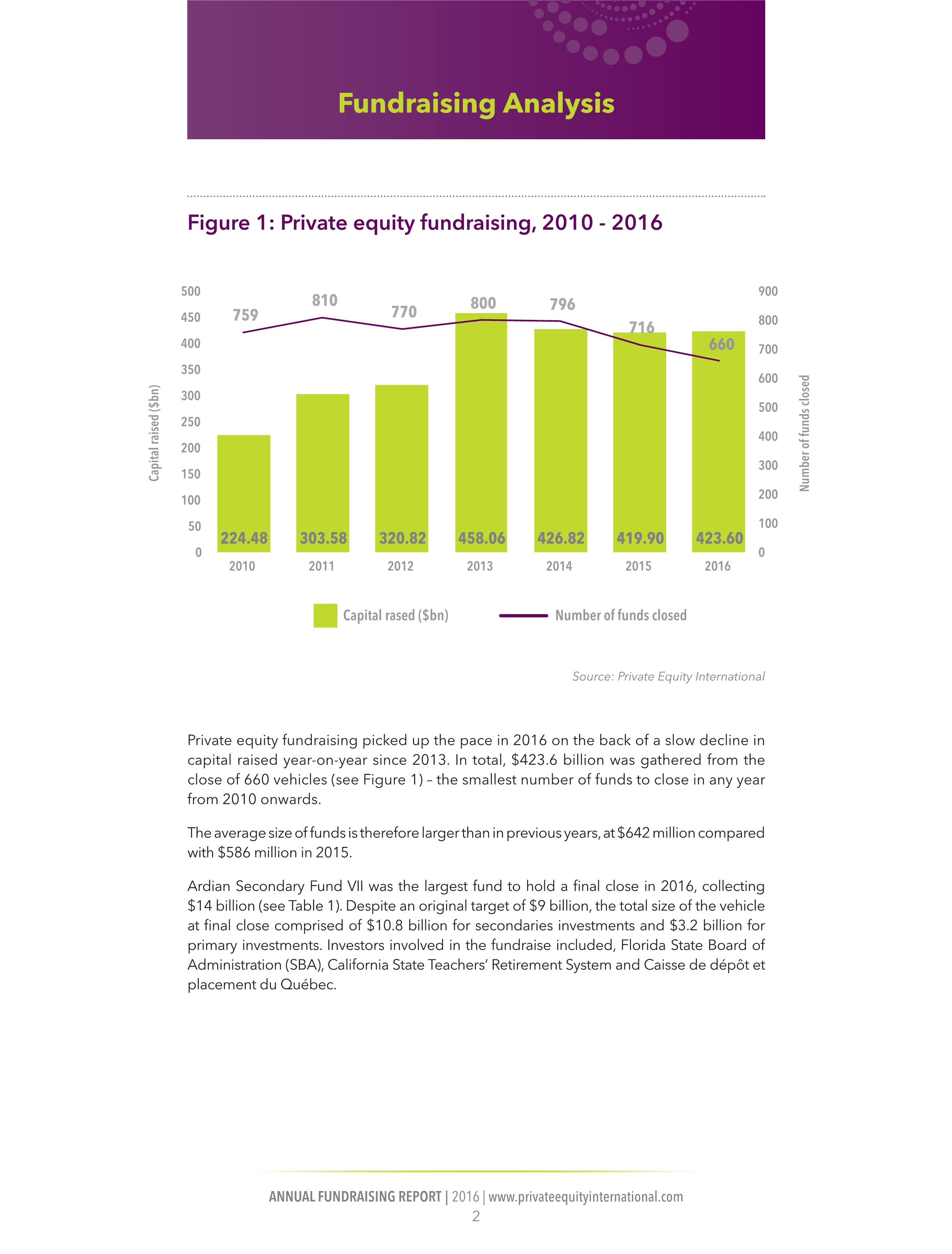 2016年,规模最大的私募股权筹资是Ardian Secondary Fund VII,筹集140亿美元。有限投资32亿美元,次级投资108亿美元。