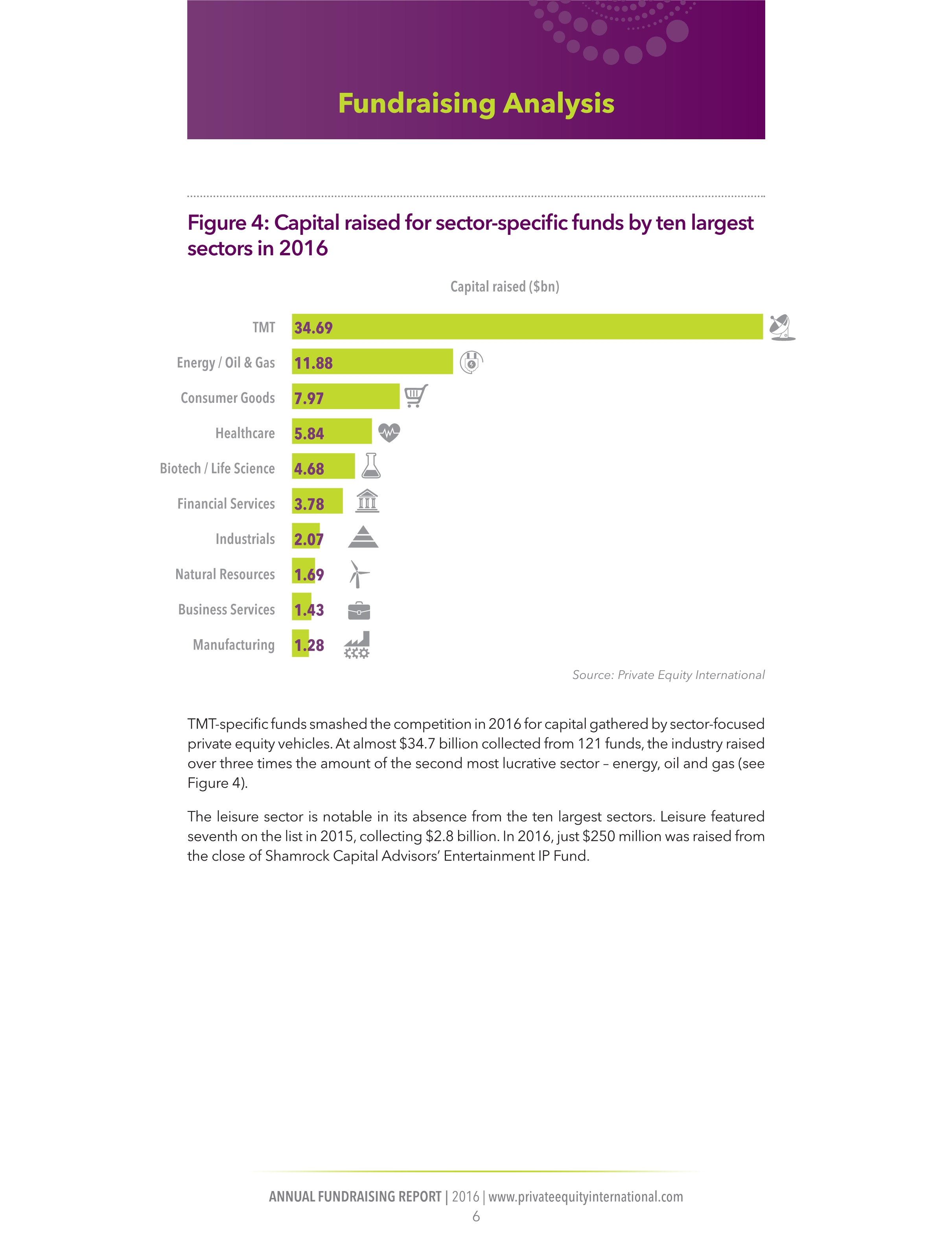 2016年,特定部门(专注于一个部门)投资额767亿美元;非特定部门(专注于多个部门)投资超过130亿美元。2016年,TMT特定部门投资额347亿美元(121笔)。