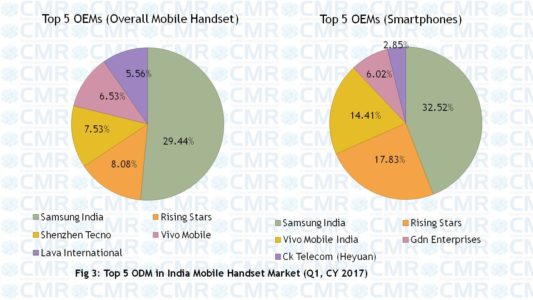 CMR电信分析师Narinder Kumar表示,“2017年第一季度,印度手机市场品牌数量整合步伐暂缓。印度原始设备制造商(OEM)数量下降了20%。国外原始设备制造商的出货量下滑了40%。未来,印度手机市场OEM数量将进一步整合。”