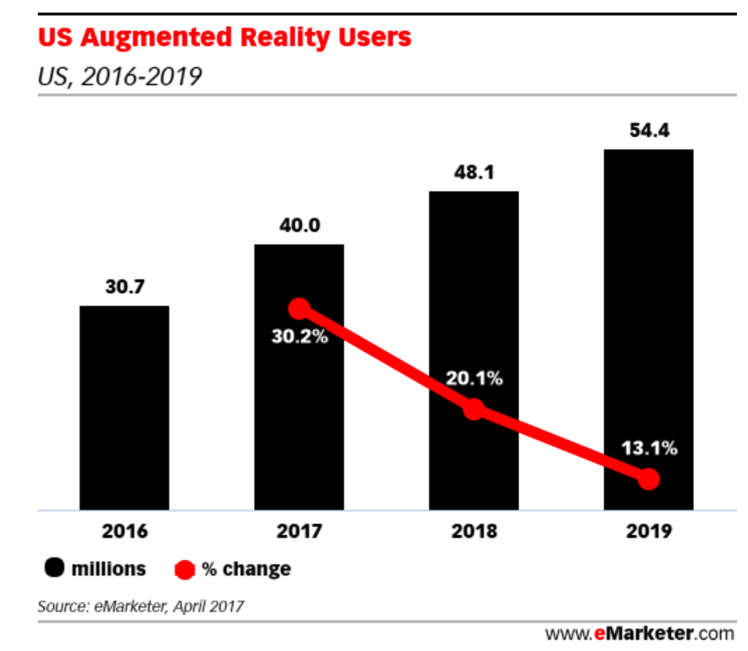 报告指出:“到2019年,AR用户预计将达到5440万,占美国总人口的16.4%,将近五分之一的互联网用户。”
