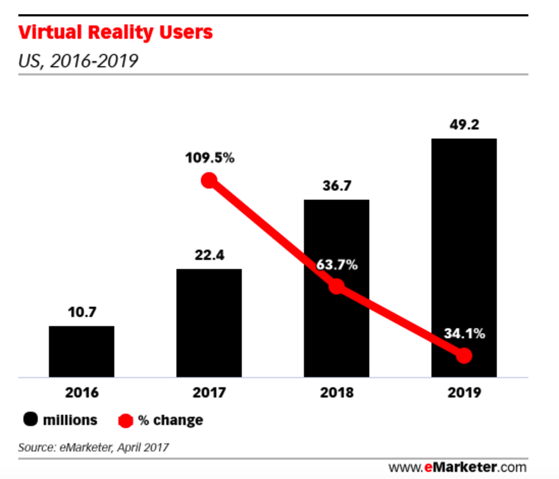 这家市场调研公司在2017年首次就虚拟现实和增强现实发表报告,他们预测今年美国将有2240万人每月都会通过一定的方式使用VR,比去年同期增长109.5%。