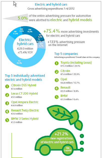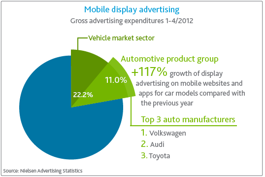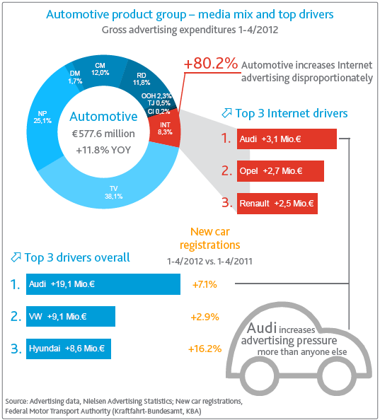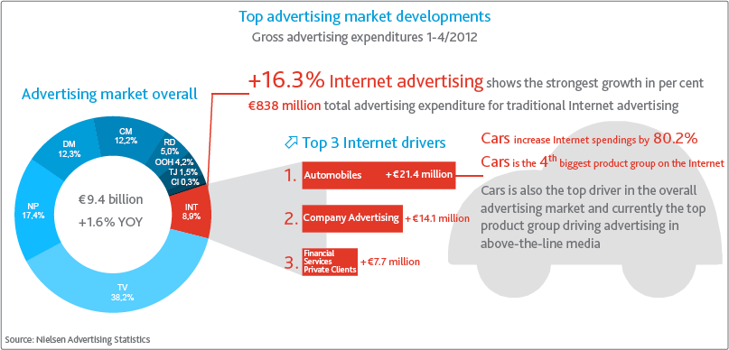 在2012年1月到4月,德国广告市场的纵隔规模为€94亿,比去年同期增长1.6%,也就是1.436亿€,在所有的广告媒体中,互联网的增长份额最大。其中增长最快的行业来自汽车行业。为了推广他们的车型,在1月到4月期间,汽车厂商增加互联网广告投入为2140万€,或80.2%到4810万€,使得汽车行业成为互联网广告市场的第四大广告主。汽车在广告增幅中的占比也超过任何一个行业。