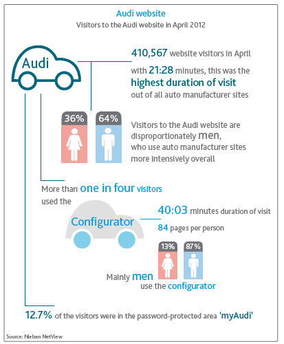 奥迪汽车网站分析:4月有41万访客,平均为22:28分钟,64%是男性,1/4的人使用configurator