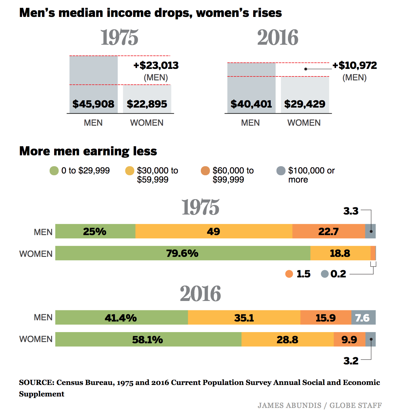 过去40年间,滑落收入底层的年轻男性数量在不断增加。目前,有 41% 的男性(25-34 岁)年收入低于 3 万美元,而这一数据在 1975 年还是 25%。