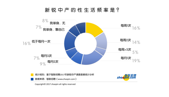 从本次调研数据看,新锐中产单身比例在所有人群中最低,然而性生活满意度却不高。具体表现在没有性生活的新锐中产占比为15%,性生活频率低于每月一次的占比16%。这与中产阶层生活工作压力大,睡眠质量不好密切相关。