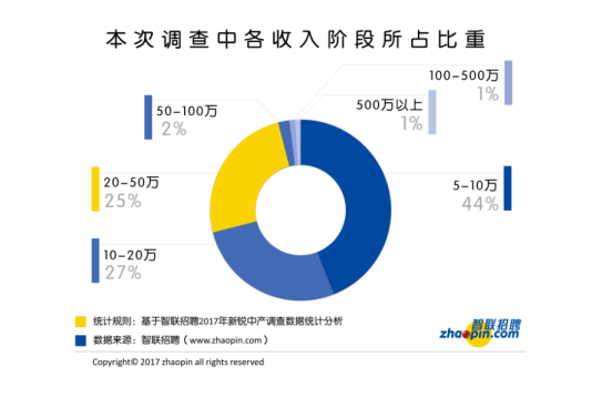 经济学上对中产阶级的划定一般指从经济地位、政治地位和社会文化地位上看,他们均居于现阶段社会的中间水平。按照麦肯锡全球研究所制定的标准,中国中产阶级是指那些年收入在1.35万~5.39万美元(约合9万~36万元人民币)之间的人;按照《福布斯》杂志的定义,中国中产家庭,年收入应该在1万-6万美元之间;而国家统计局则将中产阶级定义为年收入在7250~62500美元(约合5万~42万元人民币)之间。在此次所有受调查的人群中,5-10万的人群占比最高为44%,家庭年收入在10-20万的占比为27%,20-50万的占比为25%。据以上三种国内外对中产阶级的界定,我们将10-50万年薪人群定义为新锐中产,此次报告重点针对这部分人群的现状、问题、困惑与期望做了较为全面的调研与分析。