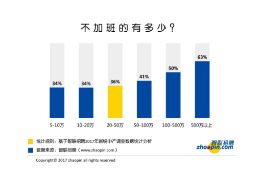 除了对收入的不满外,加班对于新锐中产来说也是一个普遍存在的事实,仅有36%的新锐中产表示不存在加班的情况。有趣的是,通过调查我们发现,收入越高加班越少,高阶层的不加班比例遥遥领先。一方面,高收入人群大多数处于决策层,他们在工作中不需要花费大量的机械时间,更多的是资源和决策方面的工作。另一方面,职场新人们少不了通过加班来实现升职加薪。
