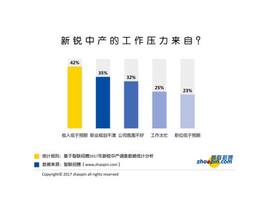 调查显示,新锐中产们的压力指数高达3.94(满分为5分)。当被问及工作中的主要压力来源是,有42%的新锐中产表示主要来源于收入低于预期,其次有35%的人表示为职业规划不清。