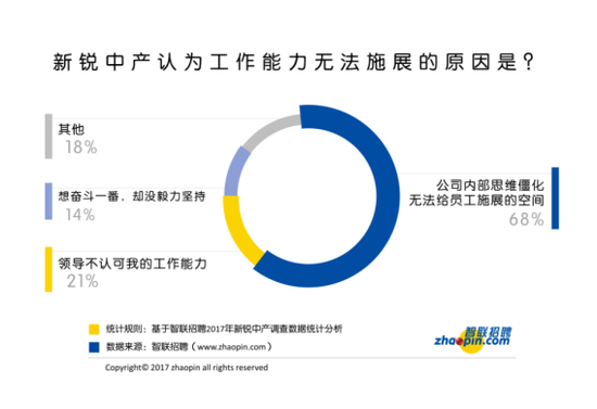 调查显示,有46%的新锐中产认为在工作中,自己大材小用。仅有29%否定了这一状态。其中,有68%的人认为公司内部思维僵化,无法给员工施展的空间,是造成自己被大材小用的最主要原因。另外有21%的人认为自己的工作能力没有得到领导的认可。