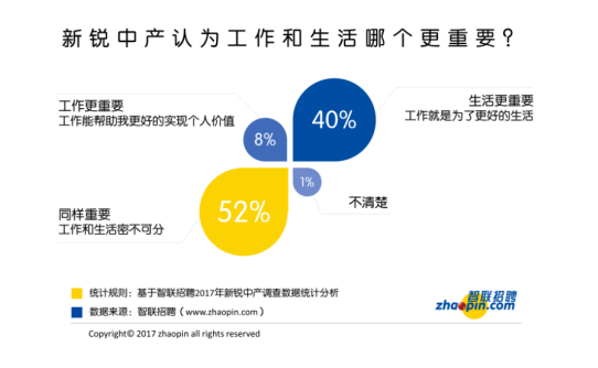 工作与生活,是每个人时间分配的两大板块。新锐中产中有52%的人认为生活与工作同样重要密不可分,40%的人认为生活更重要,仅有8%的人认为工作更重要。这一方面说明新锐中产更能正视工作与生活的关系,他们会合理分配自己的时间去做好平衡;另一方面,在移动通讯越来越发达的当下, 工作8小时的界限正在被打破,生活与工作更加融合。