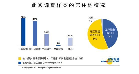 在工作城市无户口的人占据54%,有户口占据44%,其他占2%。来自一线城市的受访者最多,占据38%,其余为新一线城市(34%)、二线城市(16%)、三线城市(1%)、其他(11%)。