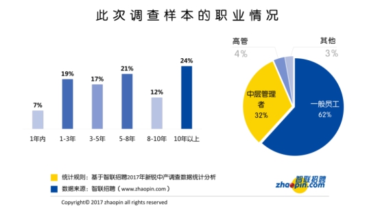 在所有被调者中,工作年限排名前三的分别为工作10年以上(24%),工作5-8(21%)年和1-3年(19%)。此外,有61%的受访者为一般员工,32%的人是中层管理者,高管和其他职级分别占比4%和3%。