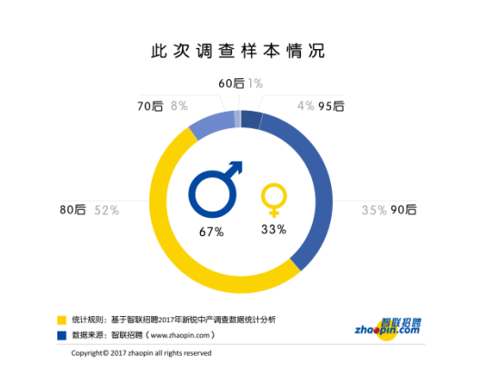 此次调研共触及49989名职场人士,其中,男性占比67%,女性占比33%。在所有受访者中,80后人数最多,占比52%,其次为90后占比35%,70后占比8%,95后占比4%,60后占比1%。