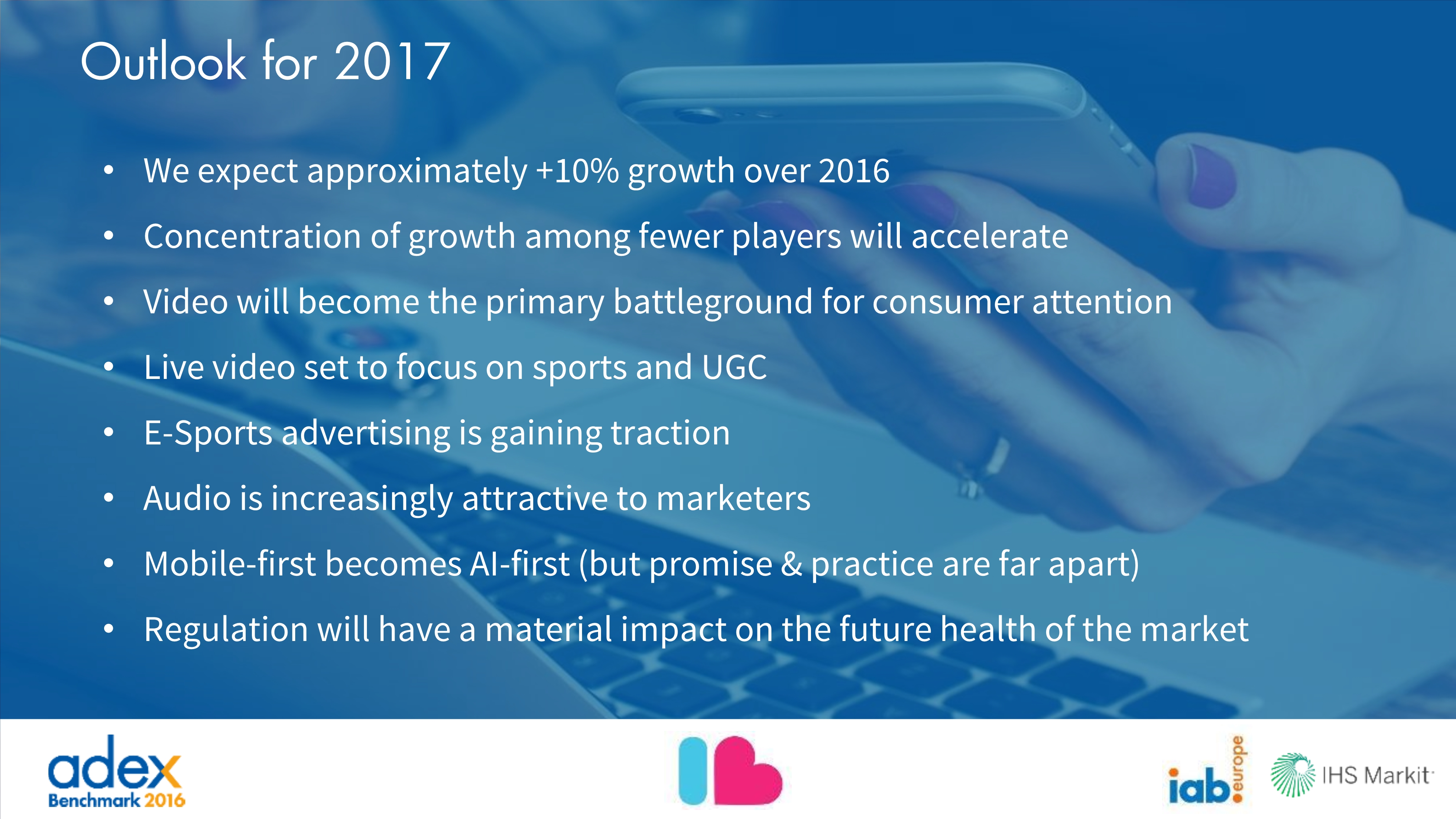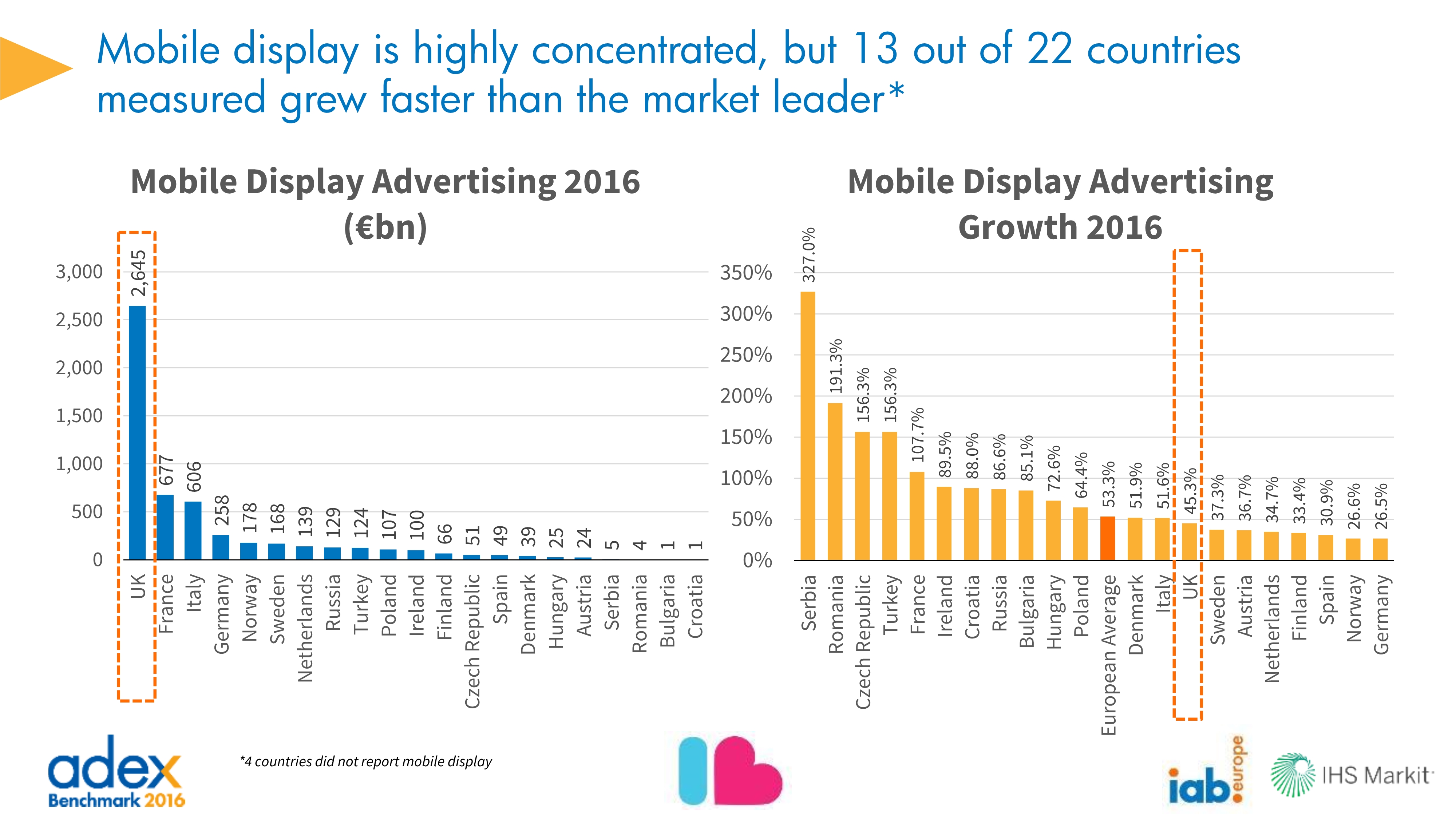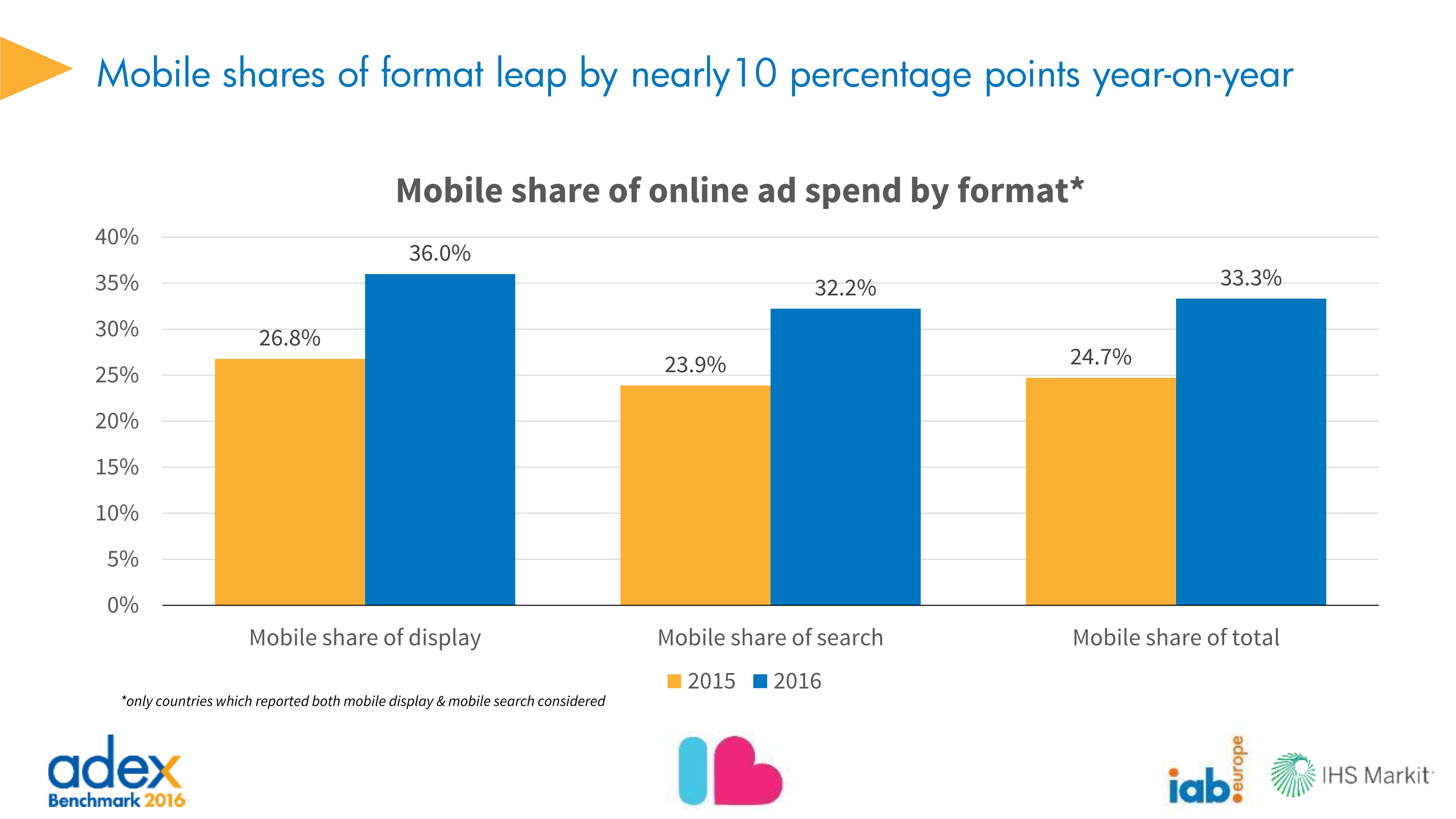 2016年,移动占欧洲网络广告份额增长至33%。塞尔维亚移动广告支出增长327%,法国移动广告支出增长107.7%。