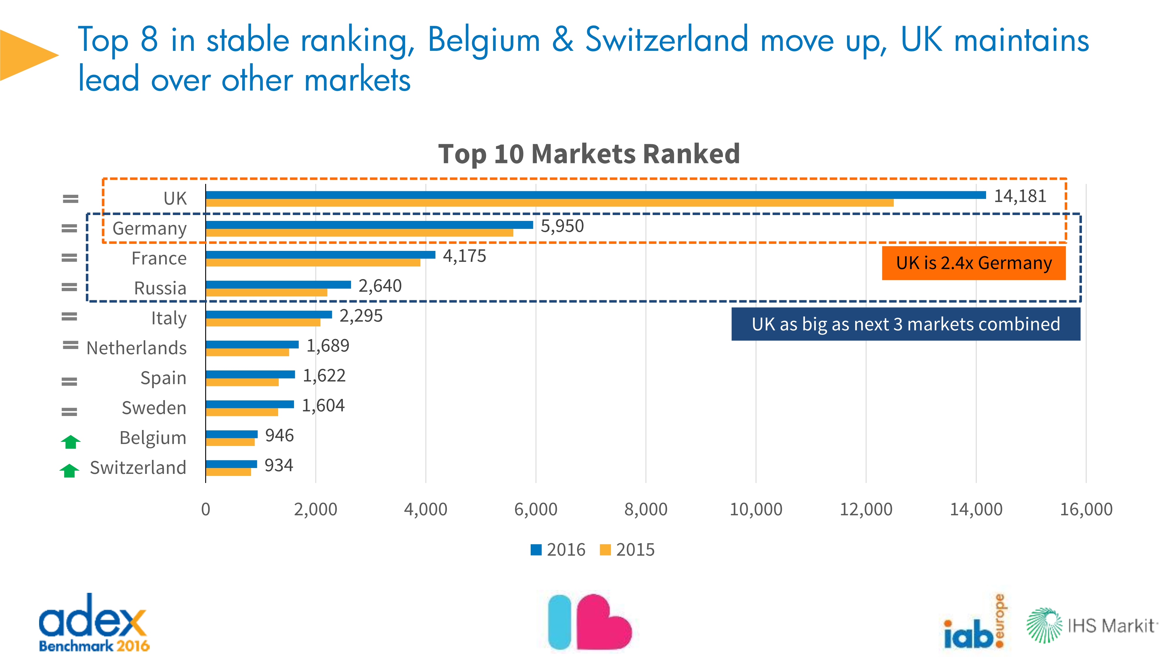 英国仍然是欧洲最大的广告市场,2016年网络广告支出156.9亿美元,增长13.4%。