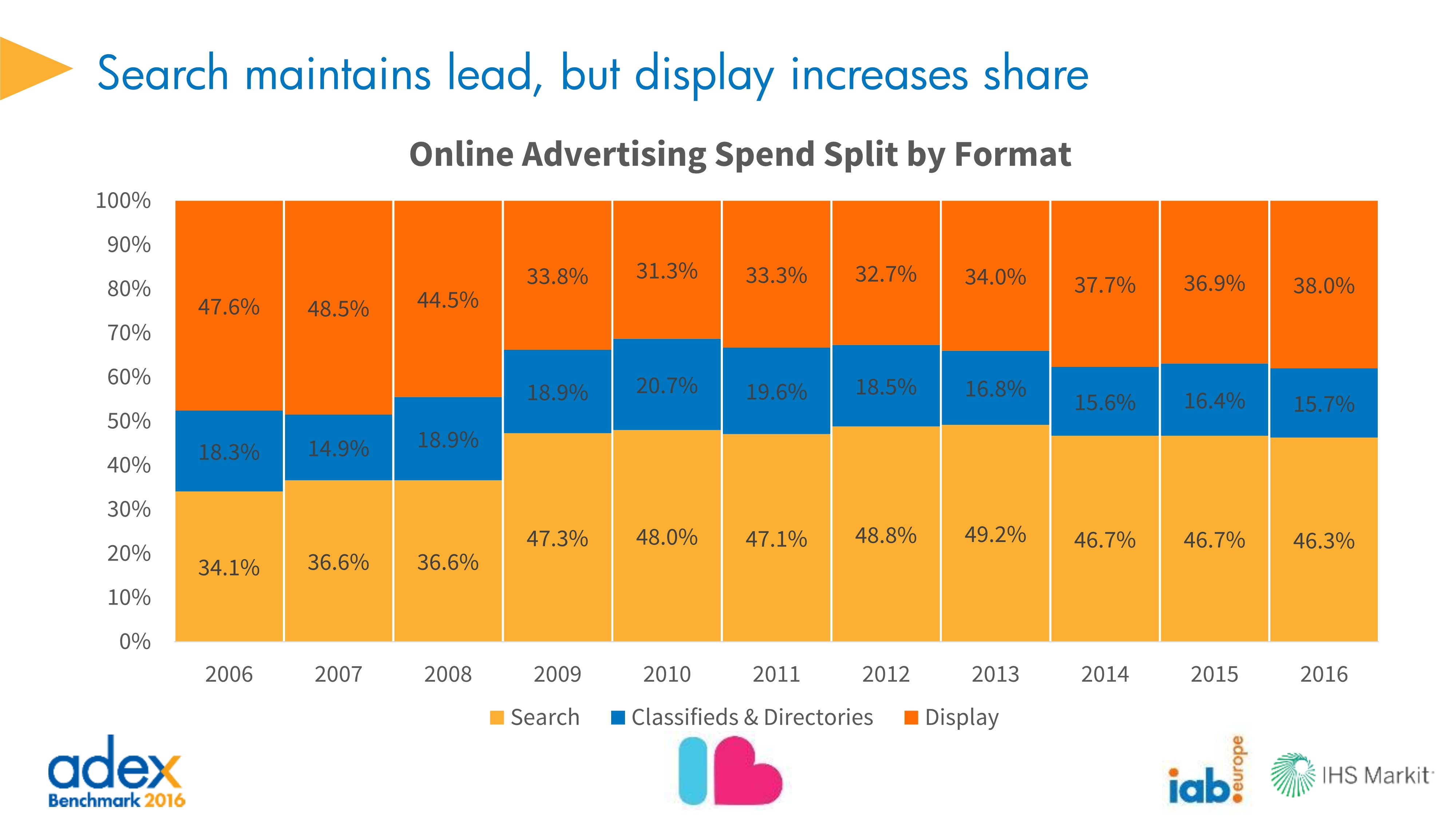 搜索广告依然是欧洲最大的网络广告格式,同比增长12.9%,达到211.5亿美元。展示广告支出增长13.8%(179.1亿美元)。分类和目录广告支出增长了7.3%(71.9亿美元)。