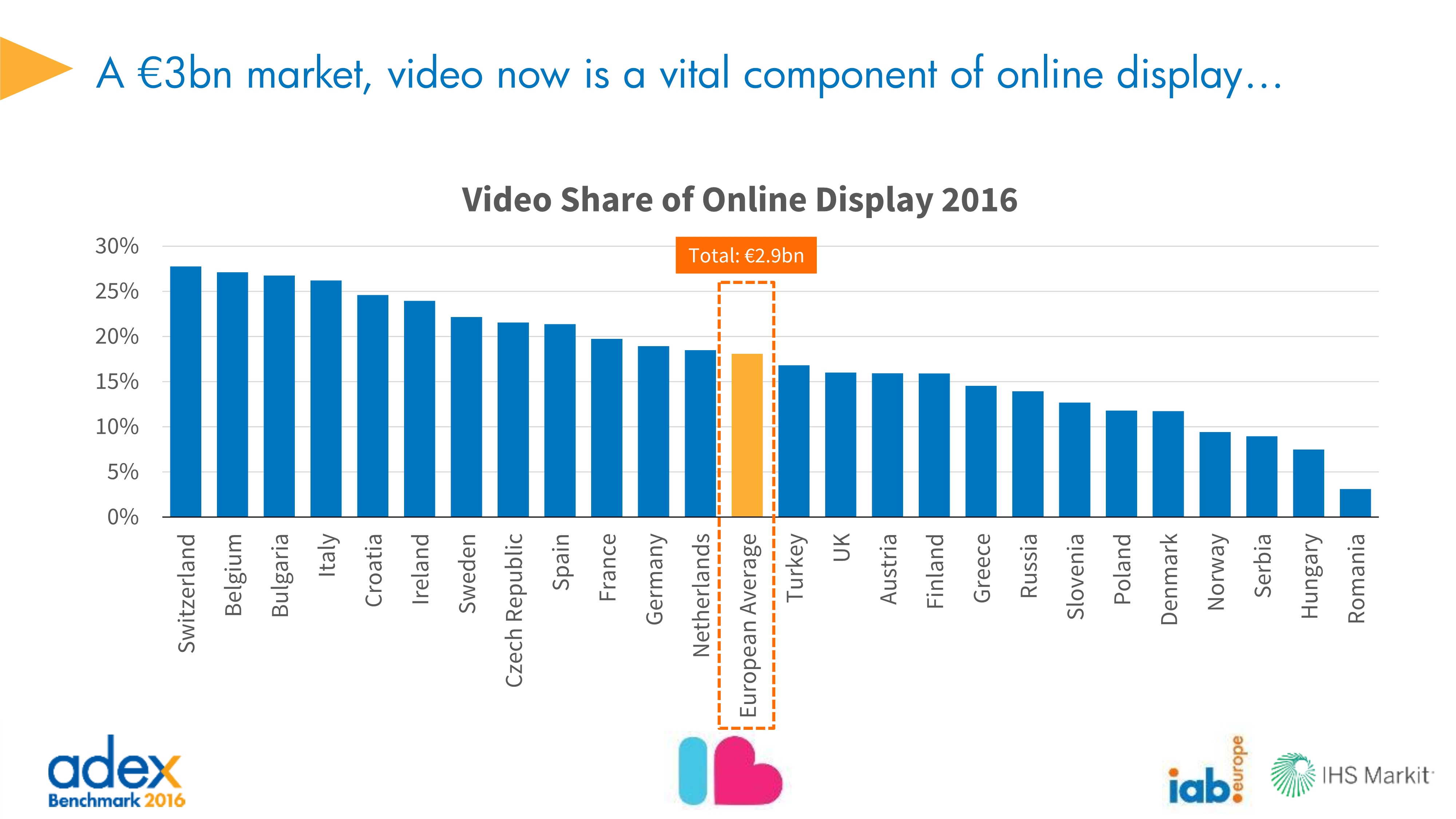 视频广告支出份额也在不断增长,2016年,欧洲网络视频广告支出近32亿美元,平均增长21.1%。