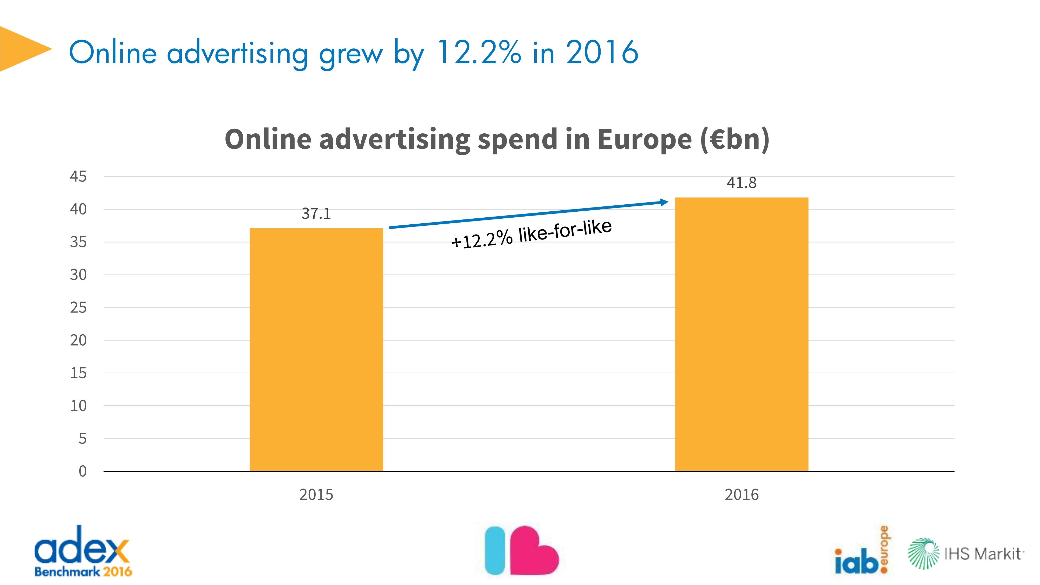 IAB和HIS Markit发布了“2017年欧洲网络广告支出报告”,2016年欧洲网络广告支出462.3亿美元,增长12.2%。