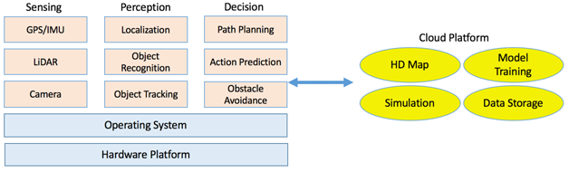 无人车是移动系统,因此需要云平台的支持。云平台主要从分布式计算以及分布式存储两方面对无人驾驶系统提供支持。无人驾驶系统中很多的应用,包括用于验证新算法的仿真应用,高精度地图产生和深度学习模型训练都需要云平台的支持。我们使用Spark构建了分布式计算平台,使用OpenCL构建了异构计算平台,使用了Alluxio作为内存存储平台。通过这三个平台的整合,我们可以为无人驾驶提供高可靠、低延迟以及高吞吐的云端支持。