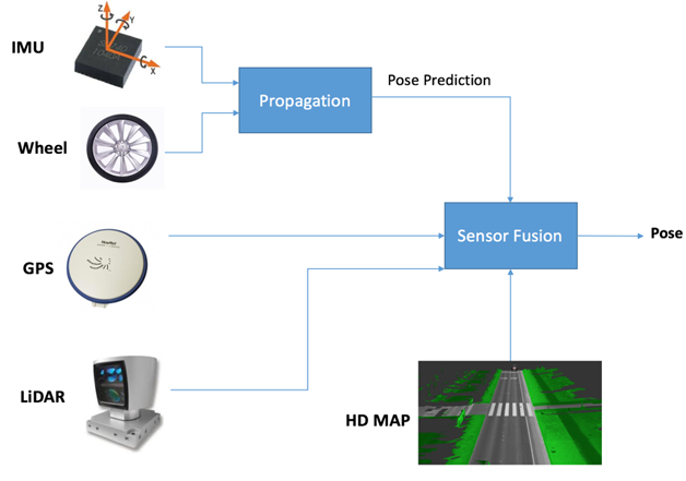 为了在地图中定位运动的车辆,我们使用粒子滤波的方法来关联已知地图和激光雷达测量过程。粒子滤波可以在10厘米的精度内达到实时定位的效果,在城市的复杂环境中尤为有效。然而,激光雷达也有其固有的缺点:如果空气中有悬浮的颗粒比如雨滴或者灰尘,测量结果将受到极大的扰动。因此,为了完成可靠并精准的定位,需要传感器融合,如图4所示,处理来整合所有传感器的优点。