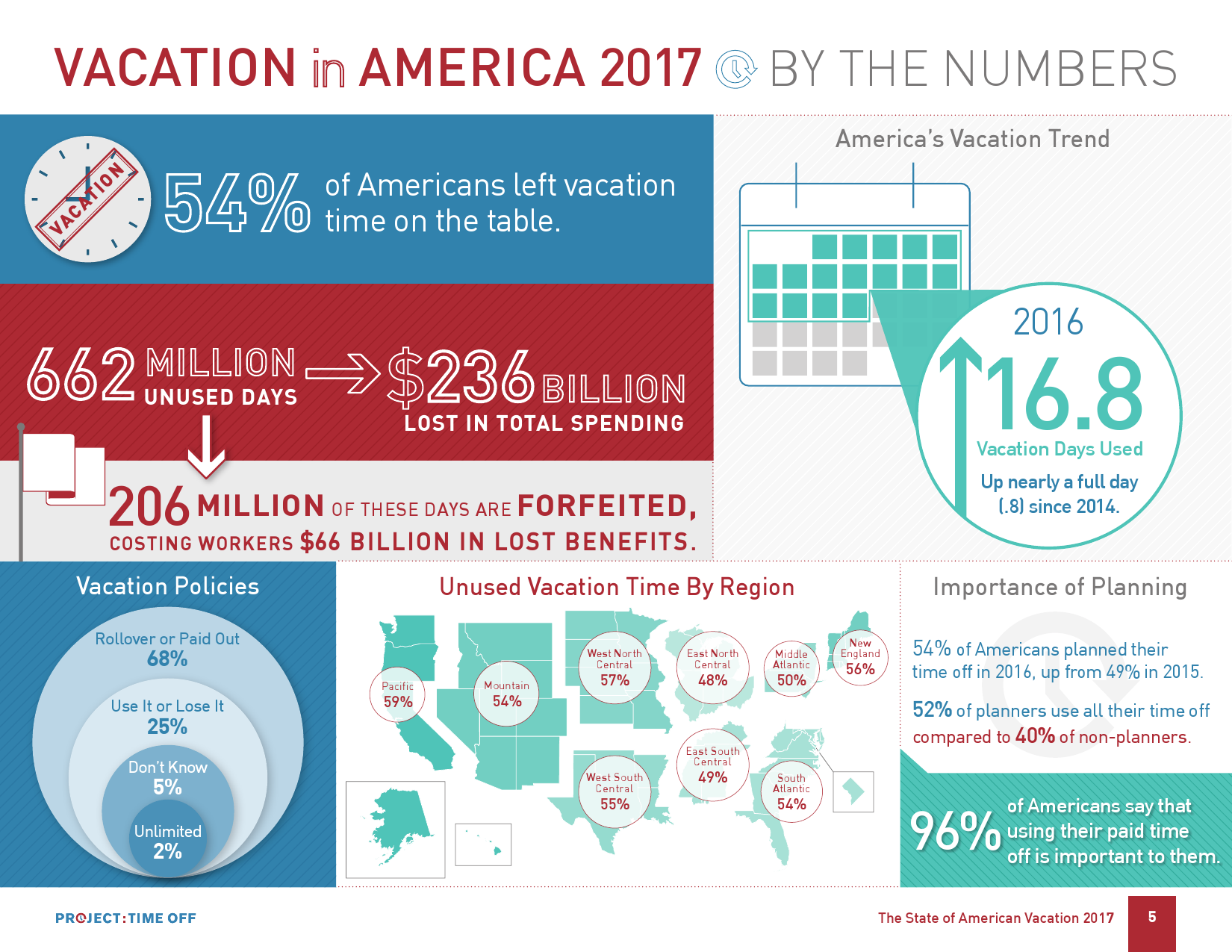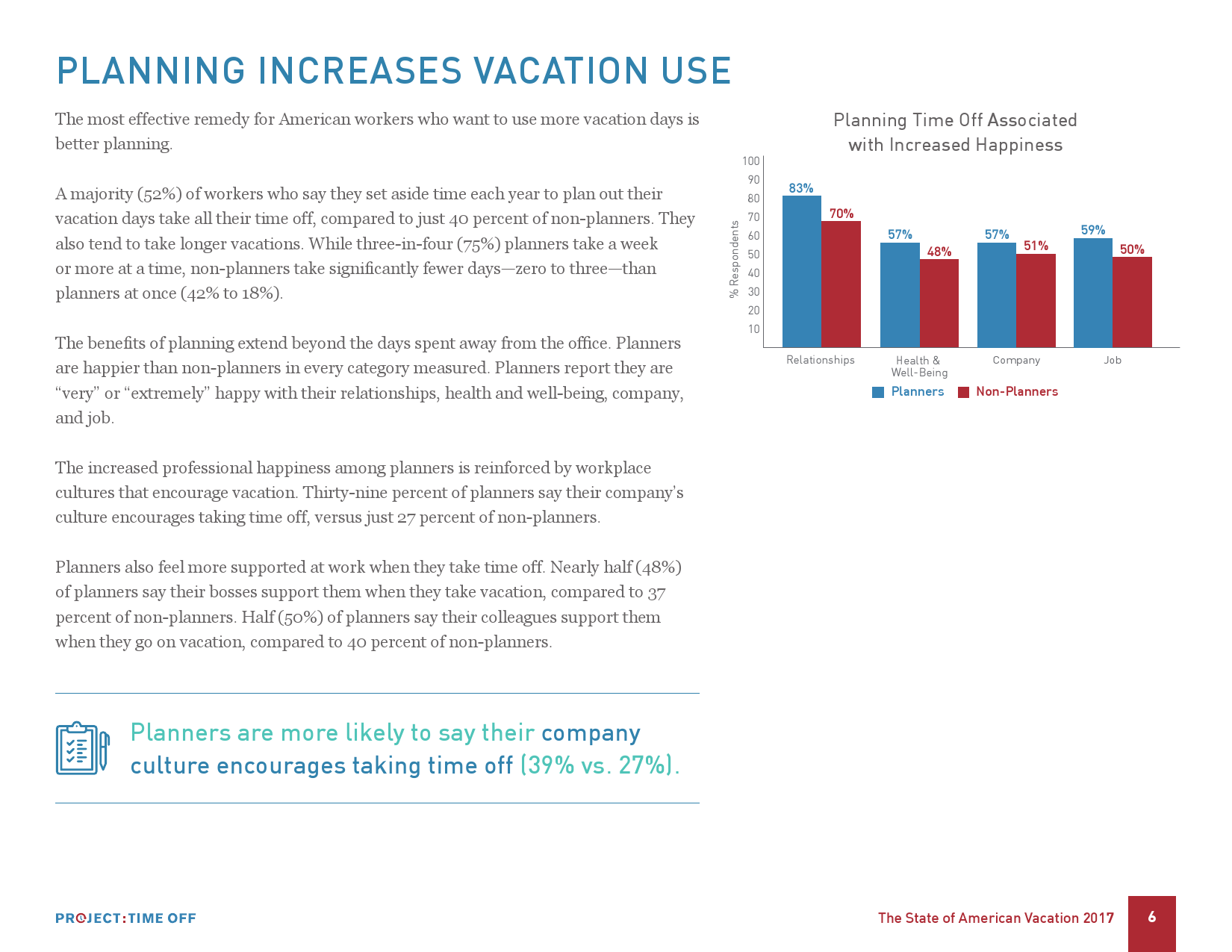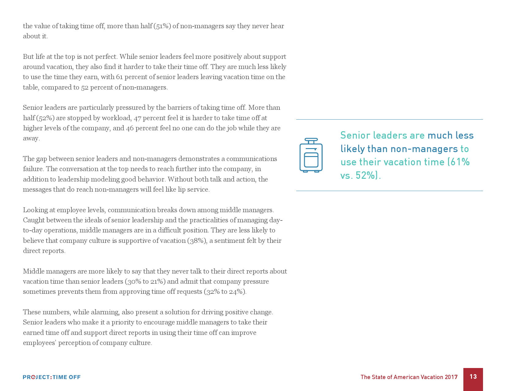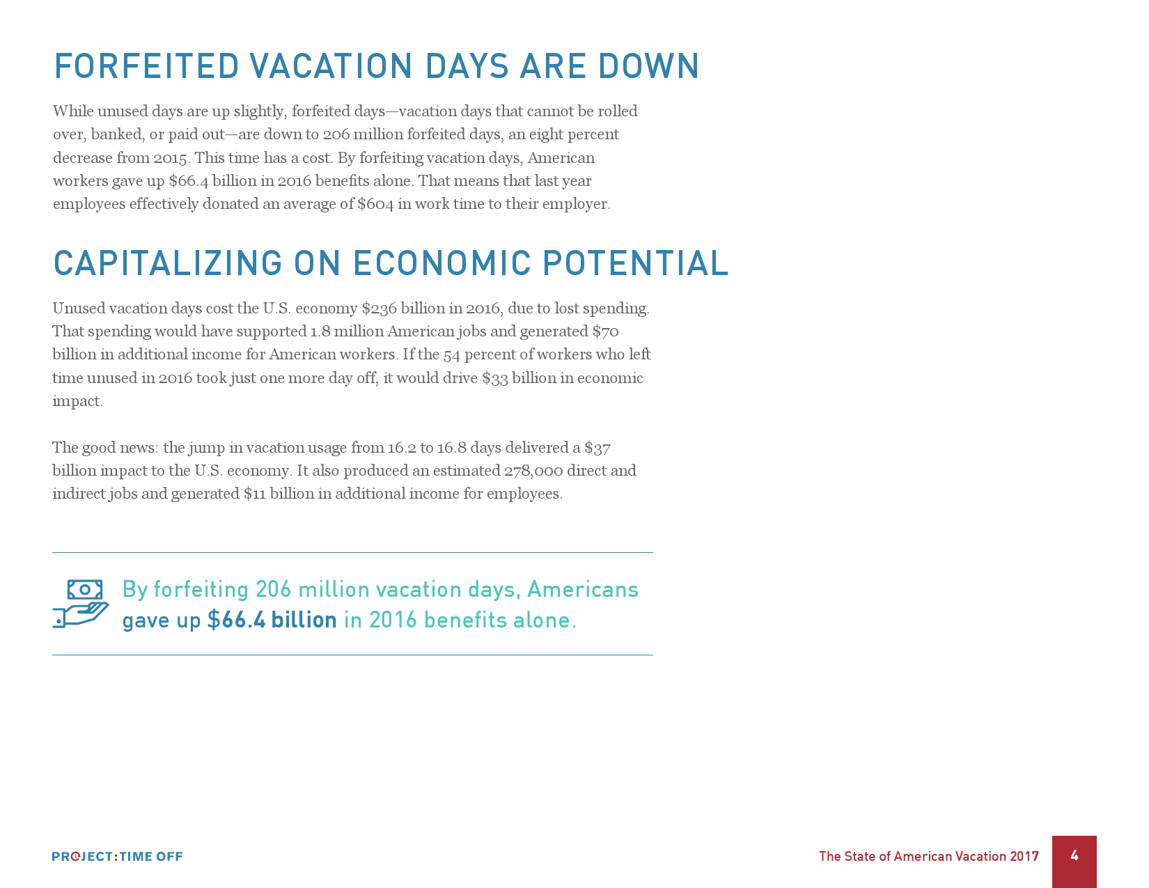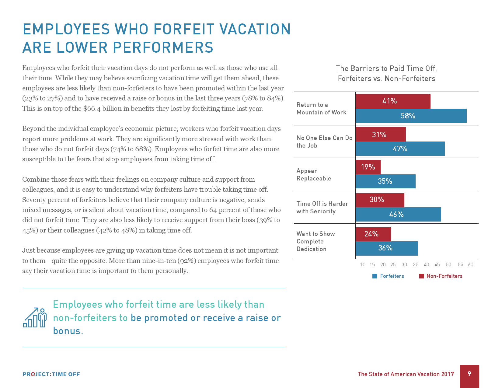 报告估计 2016 年美国人放弃的带薪休假让美国损失了 2360 亿美元,这部分本应是旅行相关消费。而那些没休假的人并没能如愿以偿,结果显示他们的工作表现并不好。相反,休假的人晋升机会更大(23-27%),过去三年这些人的奖金也上涨了(78%-84%)。