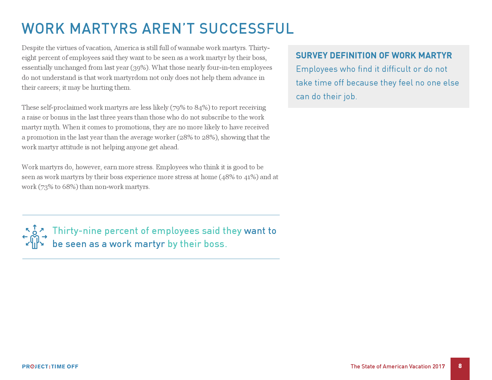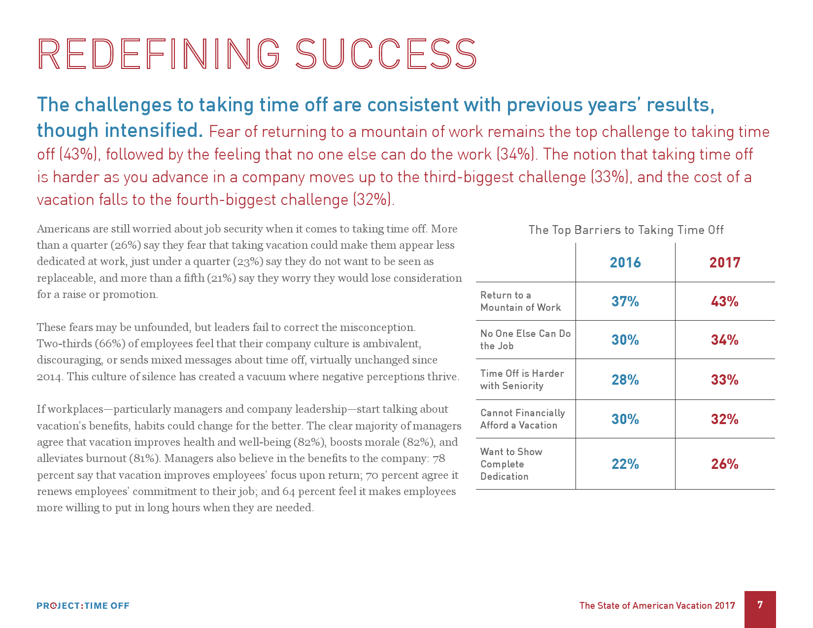 即使金融危机已经过去多年,这种心理依然存在。你从公司实际提供的带薪休假天数和人们实际休假天数的差距就能看出来,而且这一差距并没有减少的趋势。调查中四分之一的人表示他们害怕休假会显得自己工作不努力,或者证明了你的工作能被代替。五分之一的人表示担心休假可能会错过涨薪或者升职等机会。“其实最多的担心就是,休假会让人觉得你的工作可以被替代,” Denis 说,“这种金融危机后的担忧情绪还没有完全消散。”