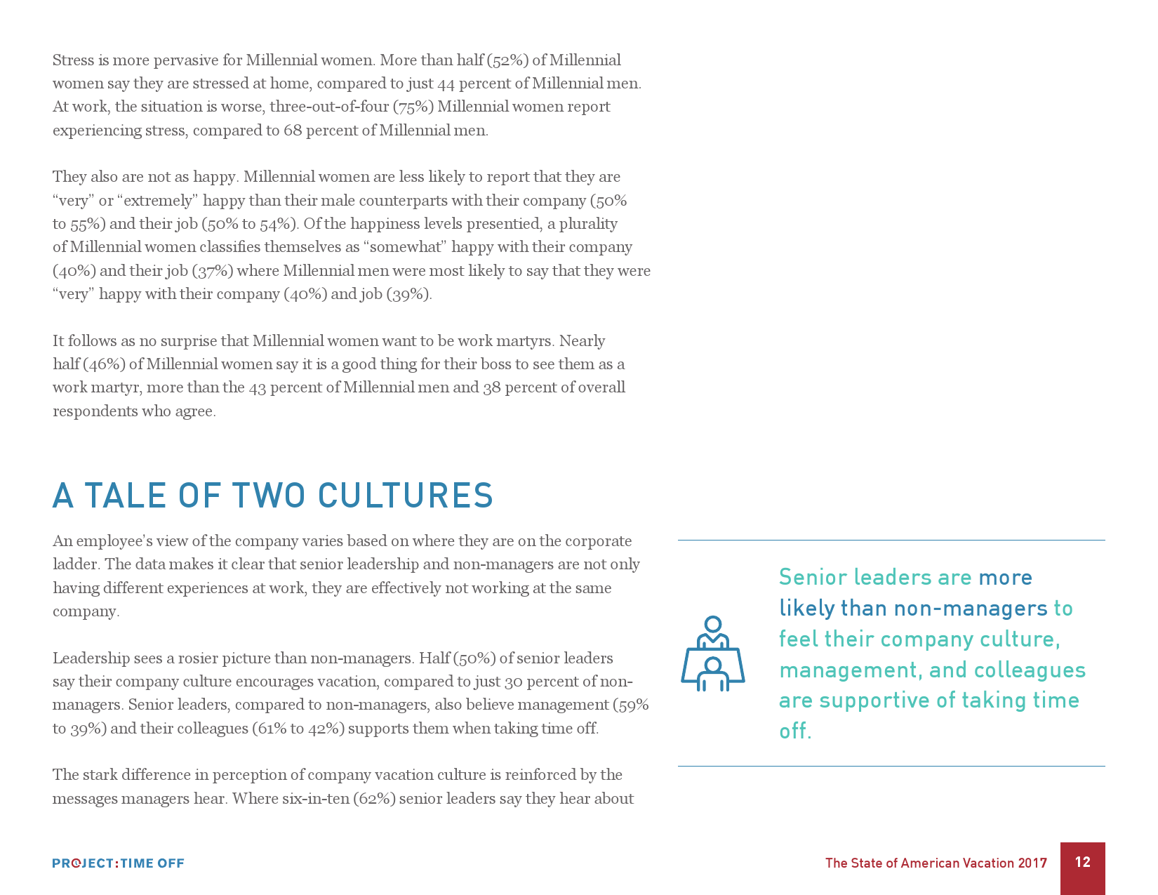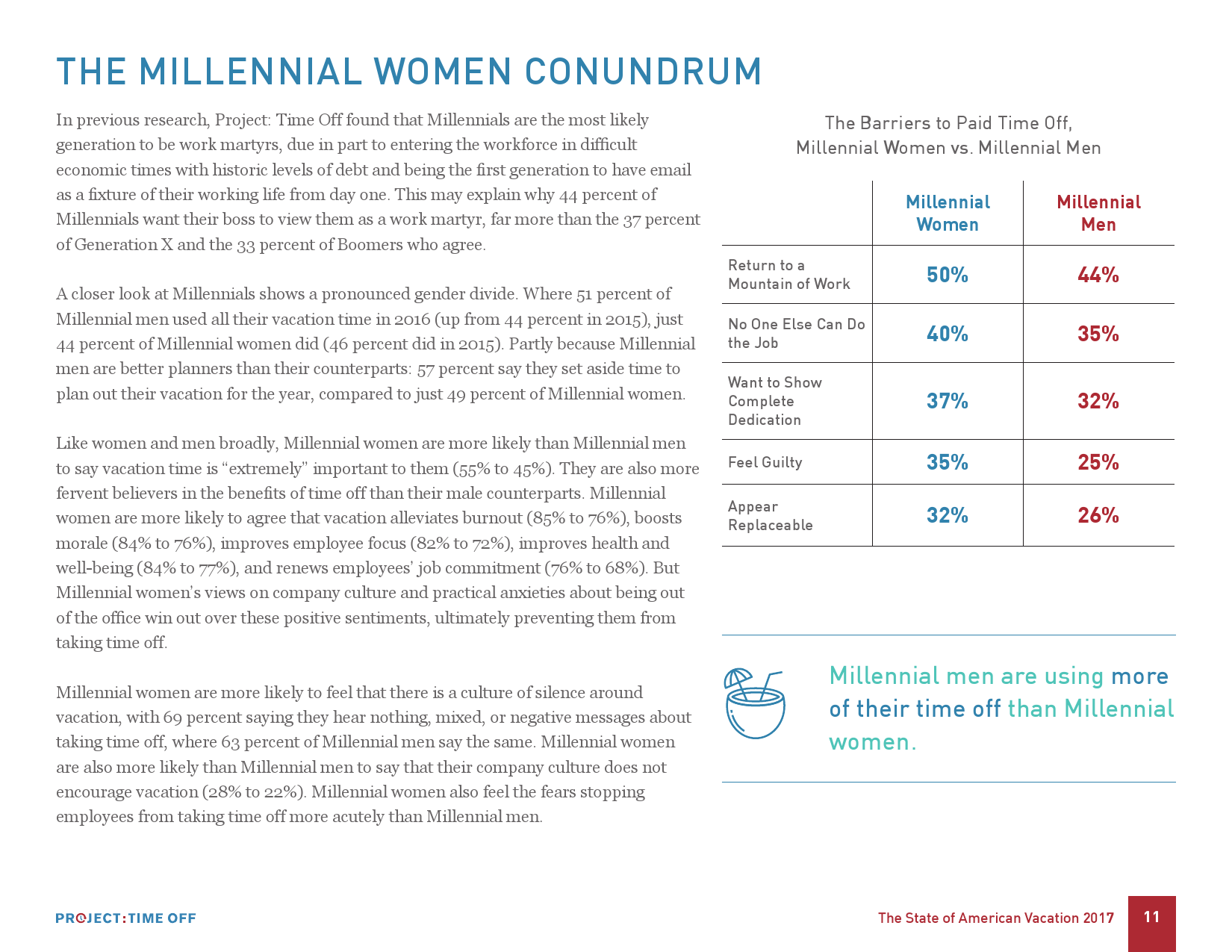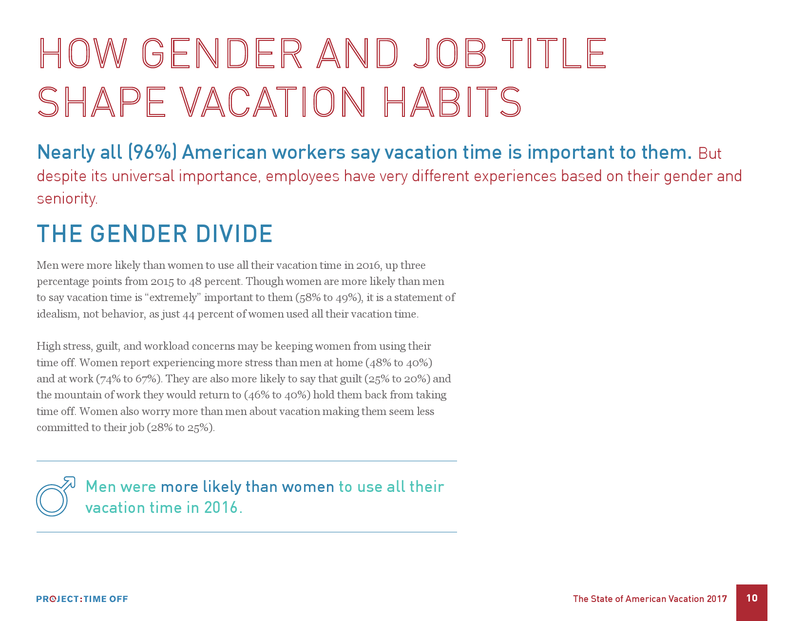 看起来男性更愿意使用带薪休假。去年 48% 休假的男性用光了带薪假期,比 2015 年高了 3%,而只有 44 %的女性用光了带薪假期。