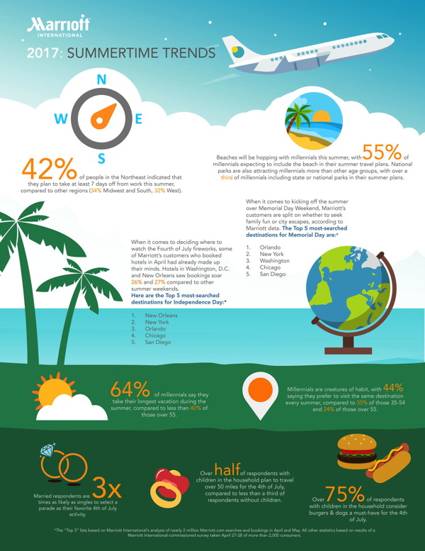 美国时间5月25日,万豪国际酒店集团发布了其首份“2017美国游客夏季旅游趋势报告”。本报告是基于对今年4月到5月万豪酒店官网Marriott.com近200万条与阵亡将士纪念日和劳动节相关的出游搜索和预订记录的分析而来。