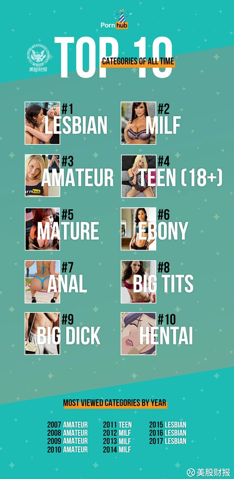 下面的图片展示了过去十年里最受欢迎的10个视频类型。女同性恋者分类名列榜首,其次是MILF和业余分类。 在2007年到2010年,最受欢迎的类别是业余分类,在2012年到2014年,MILF最受欢迎,而最近3年,女同性恋者排在了首位。