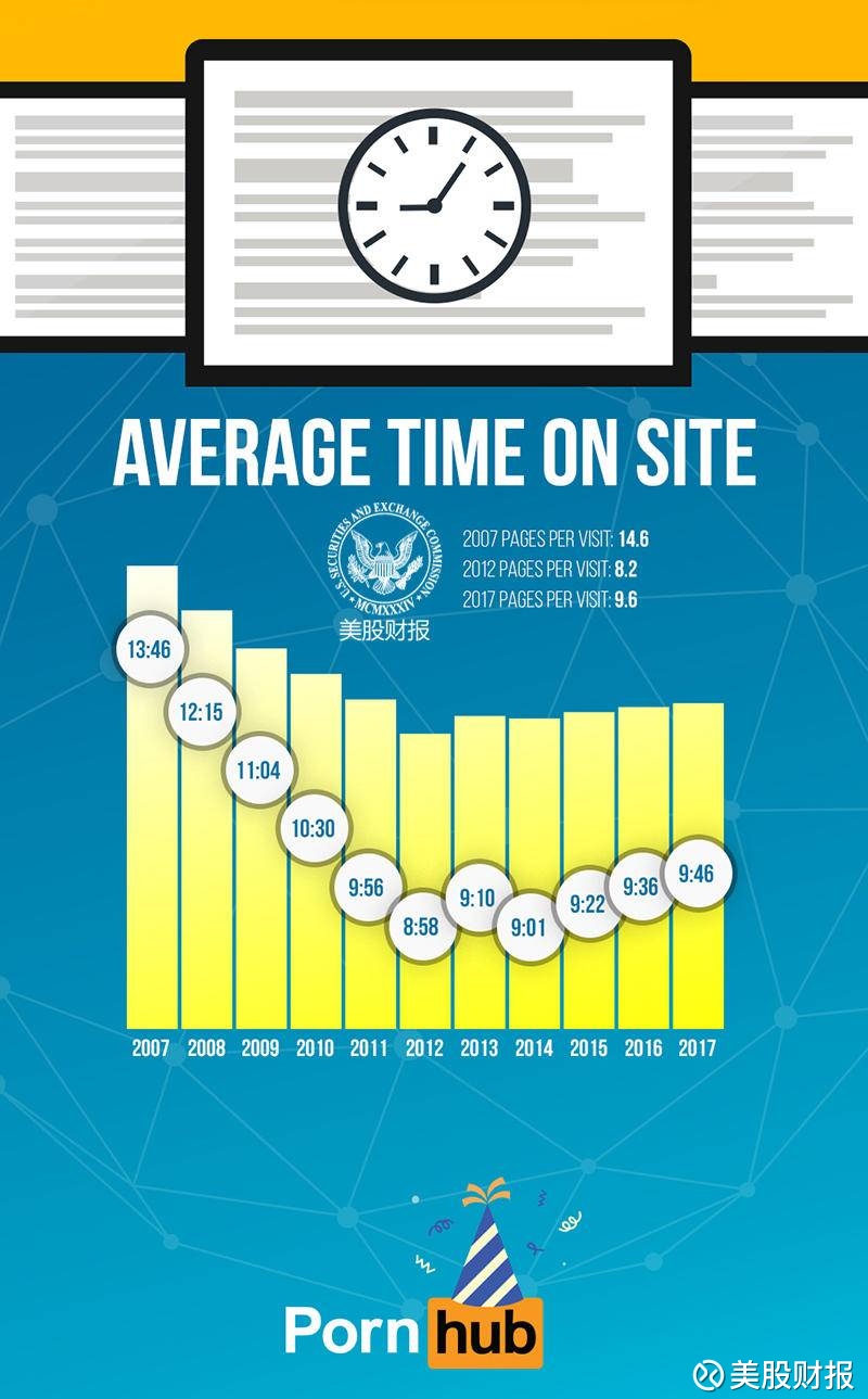 在2007年和2008年,每次访问色情片的平均时长为12至13分钟。 但这个数字在2017年却下降到了9分46秒。为什么会减少呢? 那是因为这些年来,Pornhub大大优化了用户体验,使人们可以用最少的步骤找到他们喜欢的的视频。 而且这几年的宽带速度的高速增长,所以视频的缓冲时间就大大减少了。