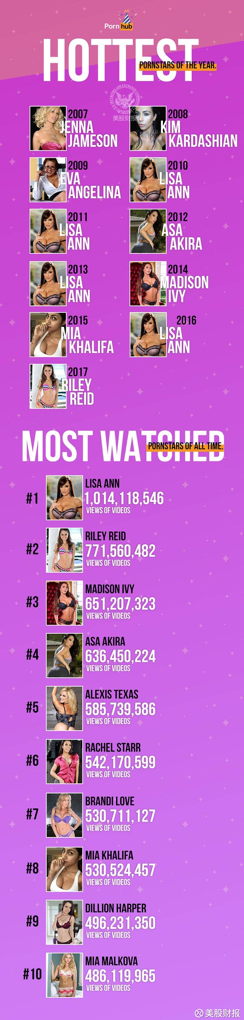 在以下信息图表中,你可以看到人们的品味在10年里面的变化。丽莎. 安( Lisa Ann)是占据年度最热次数最多的女明星,而且她的视频作品已被浏览了10亿次以上! 第二名是莱利·里德(Riley Reid),总观看数次数达7.70亿次,麦迪逊•艾维(Madison Ivy)以6.61亿观看数位居第三。