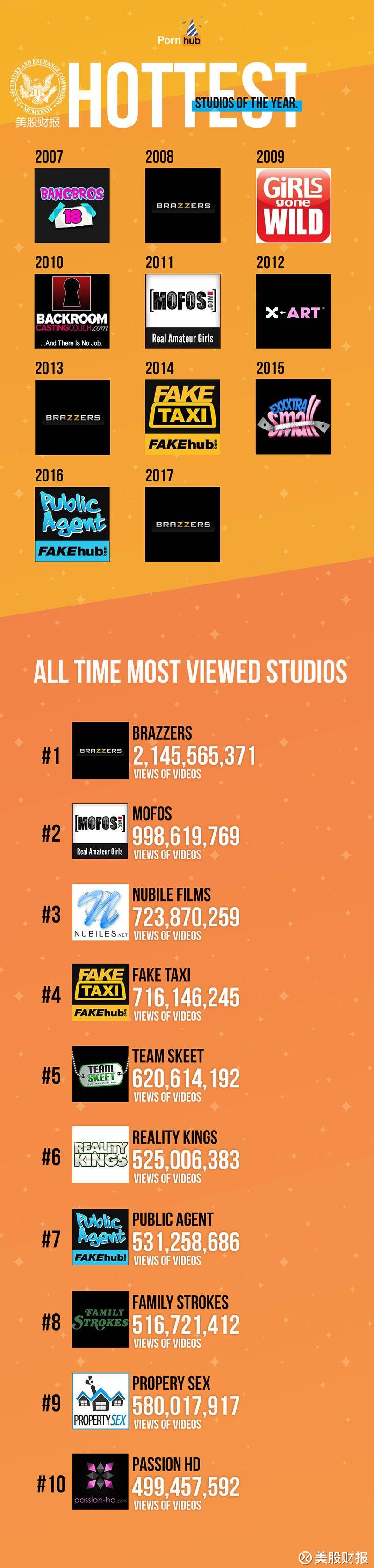 十年来,最受欢迎的制片公司也发生了很大的变化。 在十年里,Brazzers拿了3次年度最受欢迎制片公司,而且他们的视频的观看次数已经达到了21亿次! 其次是Mofos,有近10亿次的观看次数,另外Nubiles和Fake Taxi,也有超过7亿次的观看次数。